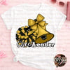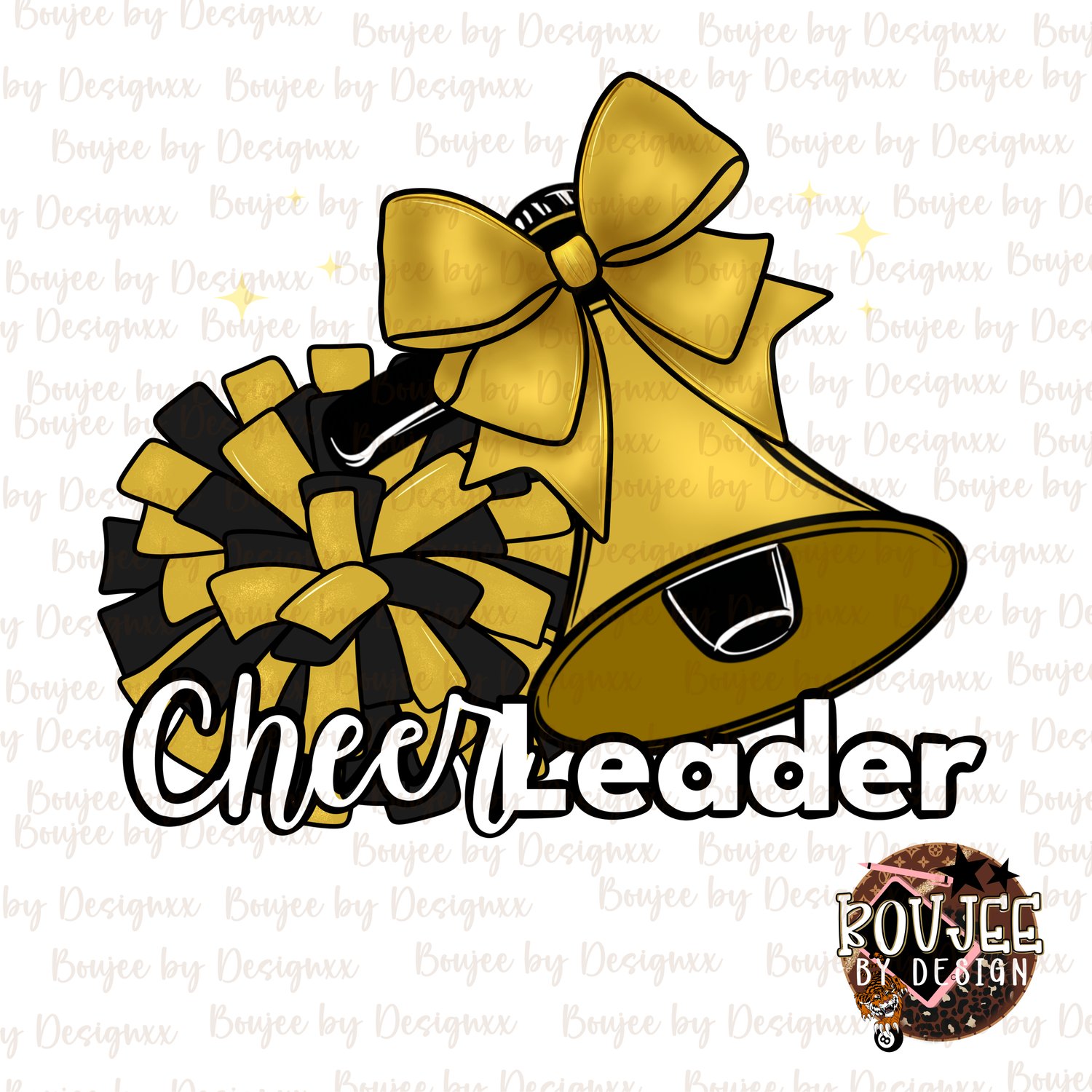 Show off your team spirit with this bold black and gold cheerleader design! Featuring a pom, bow, and bell in a fun boutique style, this PNG is perfect for cheer moms, cheerleaders, and game day outfits.