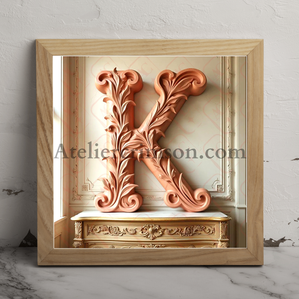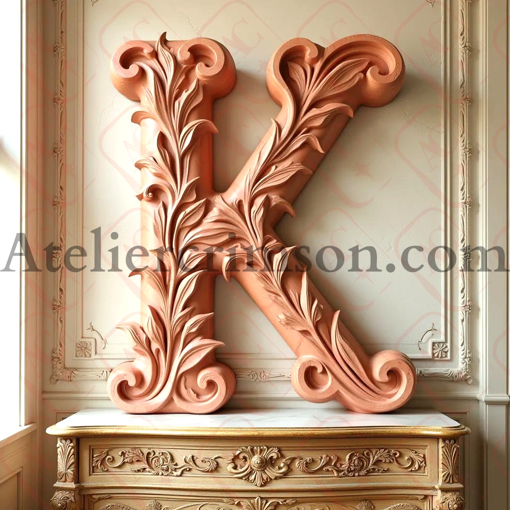 The letter K terracotta Art Nouveau typeface inspired by Alphonse Mucha's