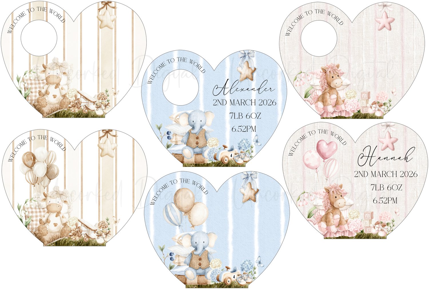 These designs come in Pink, Blue and Natural and have space to personalise, picture shows examples. They come with and without a photo space.