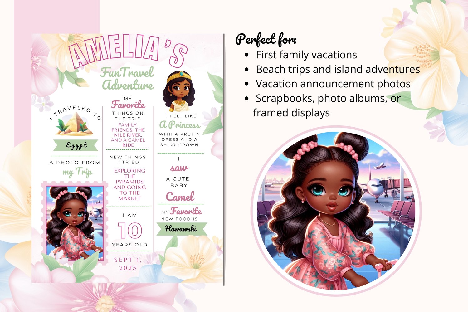 - Spaces to personalize with your child’s name, age, destination, photo, and travel highlights