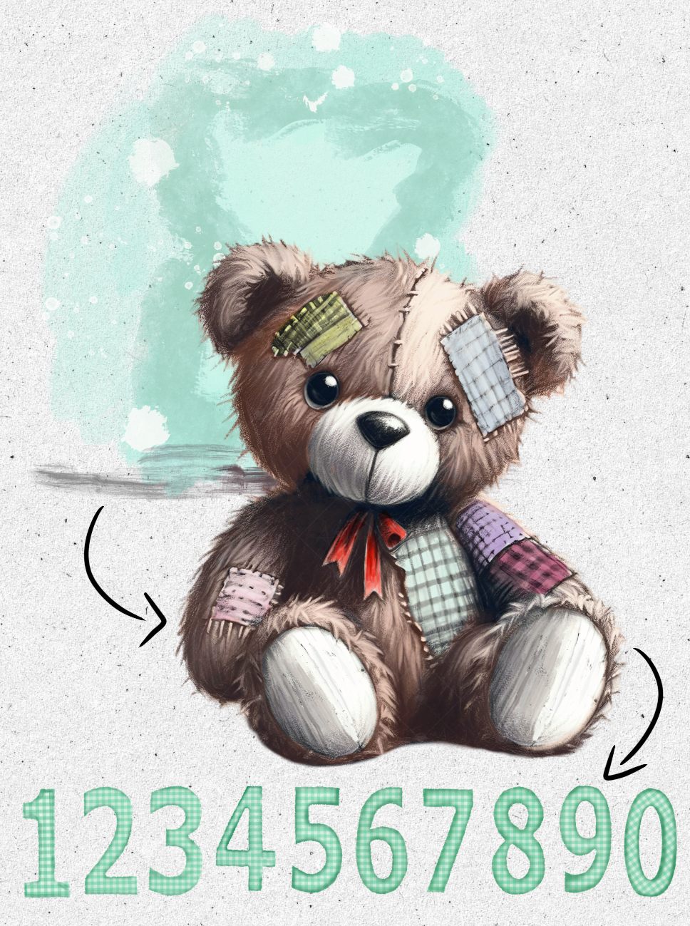 Adorable patch teddy bear bundle. 34 PNGs, 3 colours. 3 Backgrounds, numbers 1-0 in pink, blue and green, gorgeous patch bear. Sublimation, print. Instant download. Designed on a 10” x 10” canvas so can be used for clothing or sized down for cards, mugs, keyrings etc. ideal for Birthdays or use the adorable bear on his own for any gift.