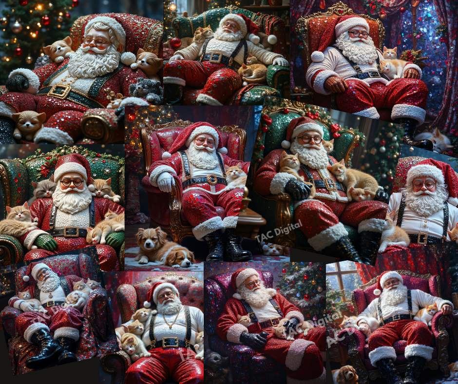 Explore a collection of enchanting designs where the festive spirit of Santa meets the playful charm of kitty cats, all adorned with shimmering gemstones. These AI-generated artworks capture the whimsical magic of the holiday season, with a touch of sparkle and feline delight. Perfect for those who love a unique, festive twist on classic holiday themes, these designs are sure to bring joy and wonder to your home or digital collection.
