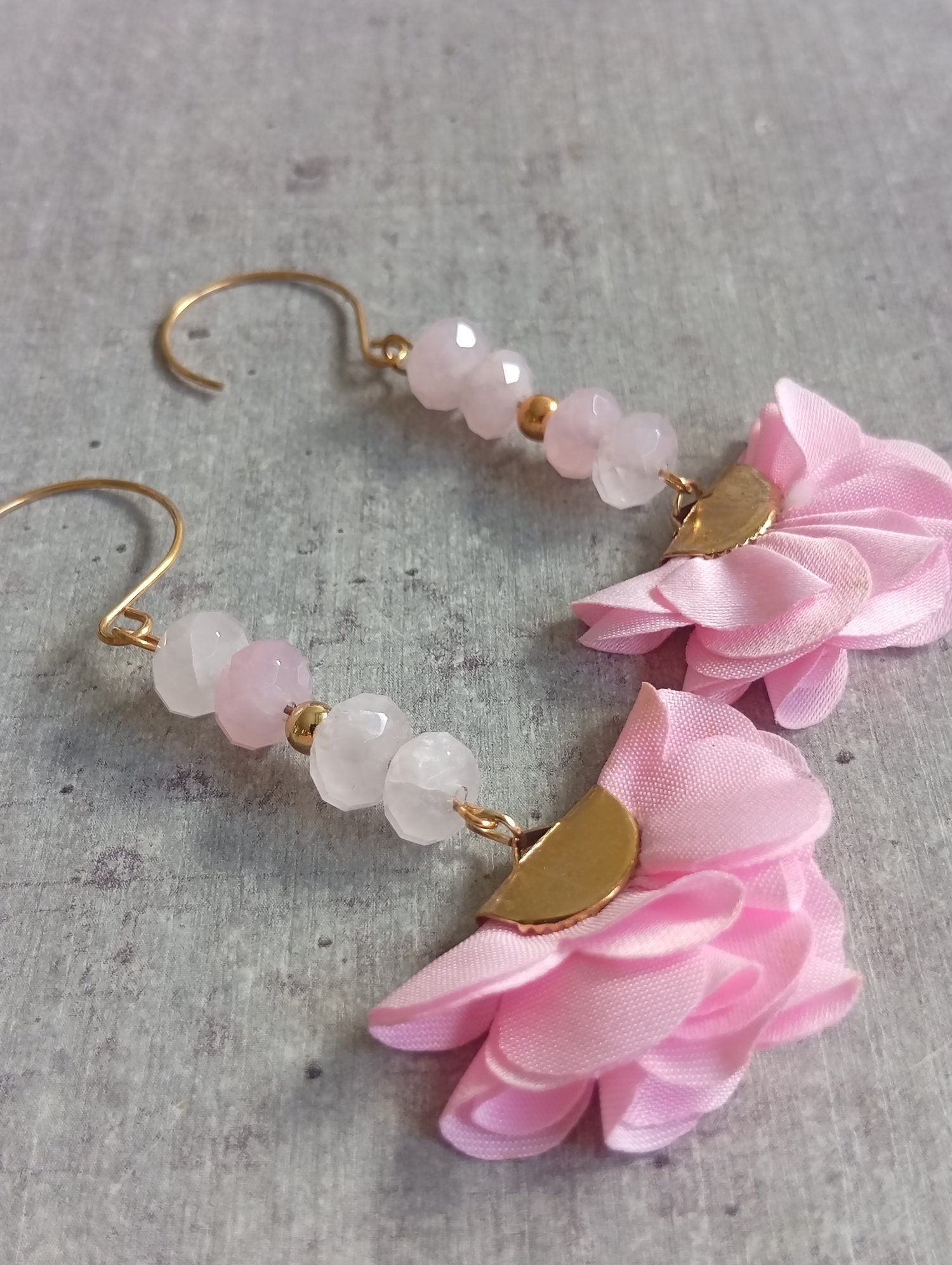 Elles mettent en valeur deux perles de quartz rose facetté, montées à la main avec soin.
