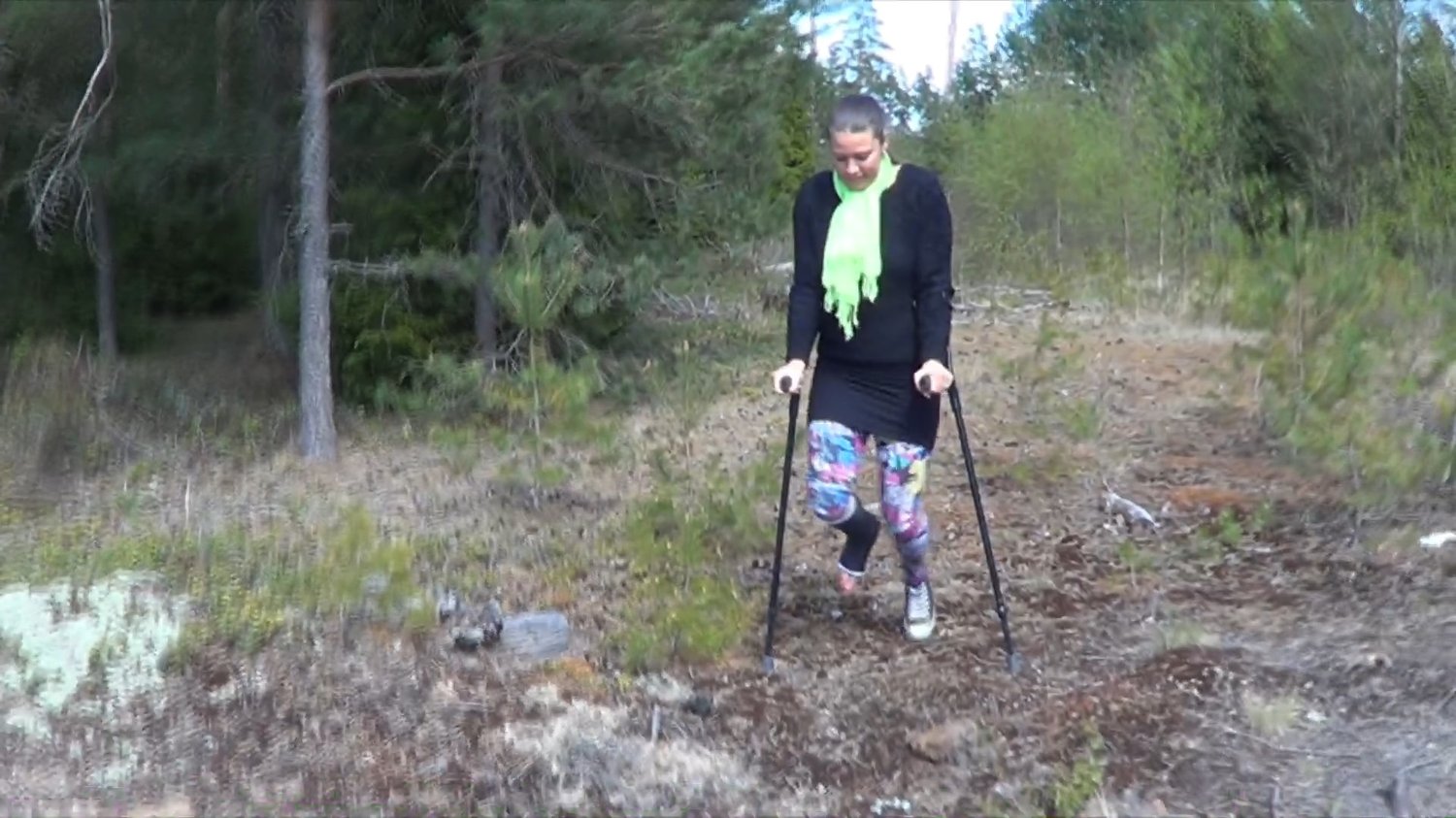 Sandy has come with us to show us her best mushroom spot in the woods.Unfortunately, Sandy has a black SLC on her right leg and is therefore forced to jump on crutches.After a while Sandy manages to get a thorn in her toe and she decides that she unfortunately can not get into the forest and turns to get back to remove the thorn and also show off her SLC and painted toes to us.