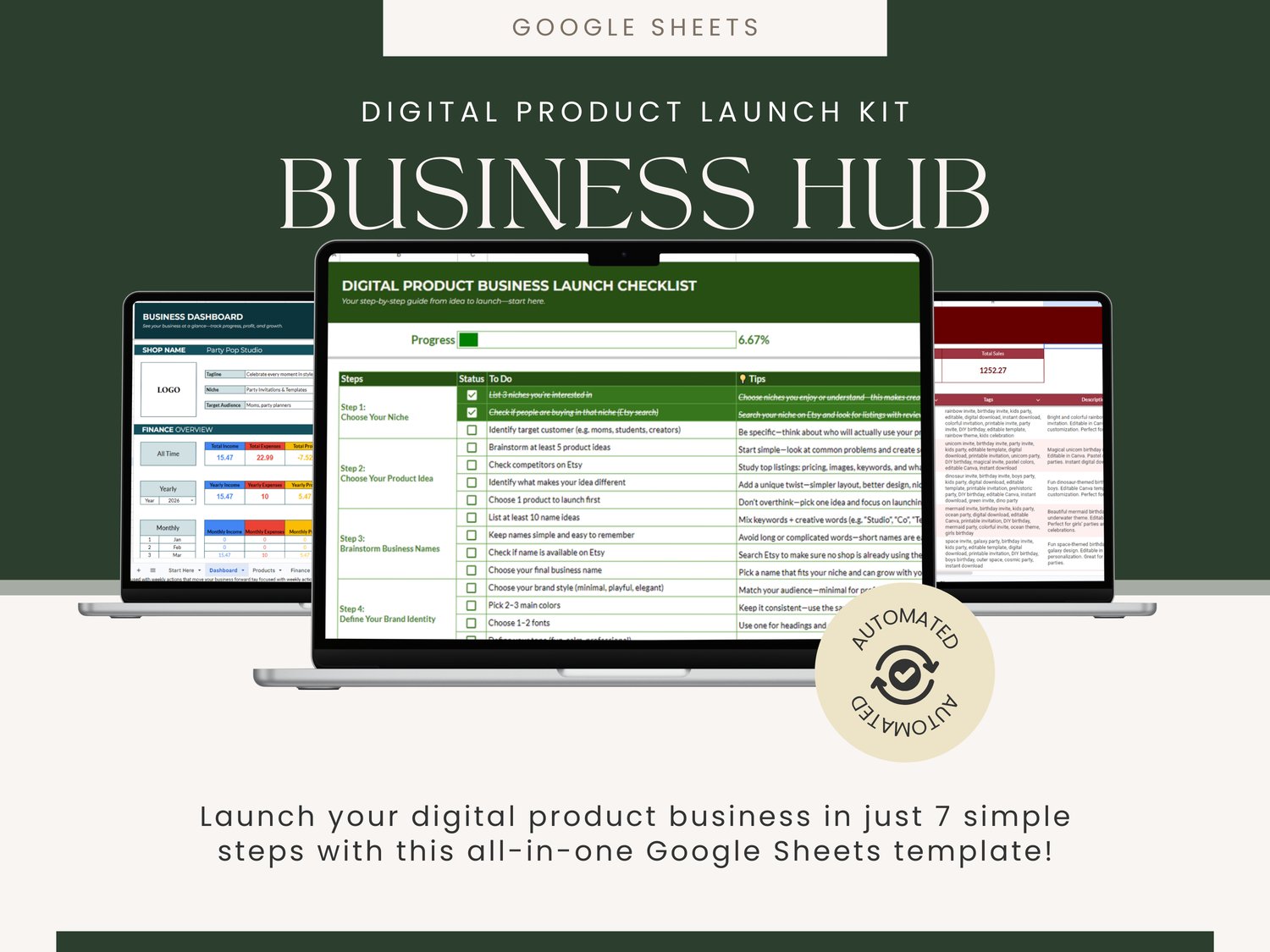 Launch your digital product business in just 7 simple steps with this all-in-one Google Sheets template!