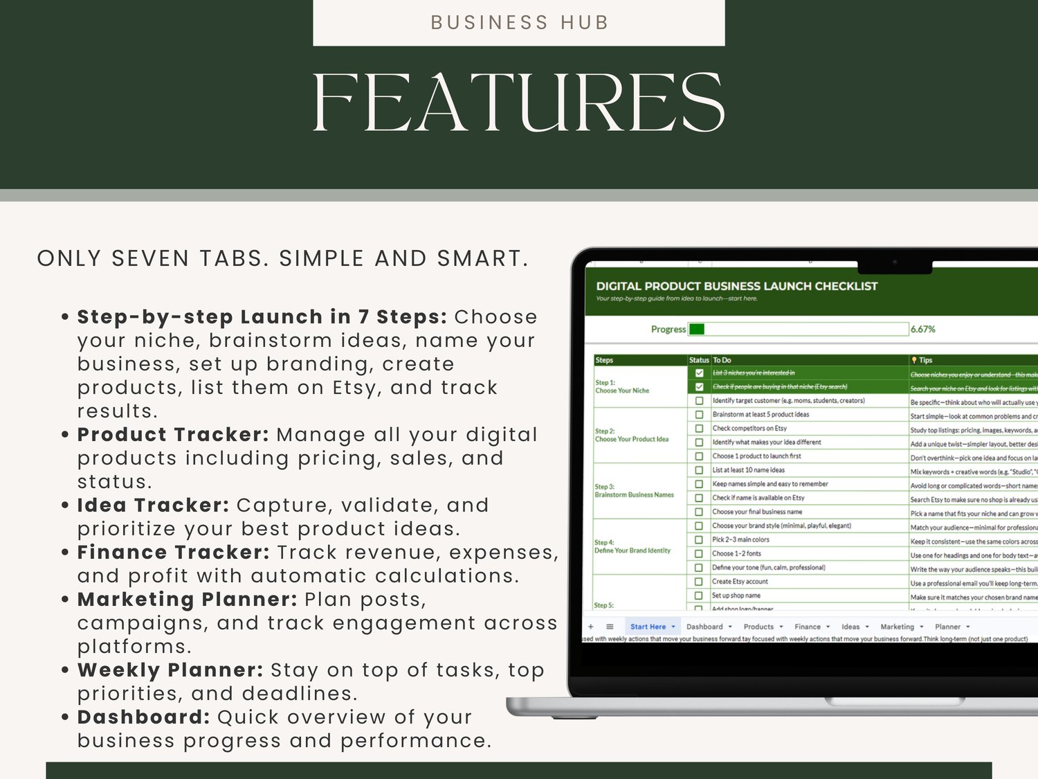 Digital Product Business Hub, Google Sheets Template, Launch Your Etsy Business in 7 Steps, Planner, Tracker & Idea Organizer for Beginners