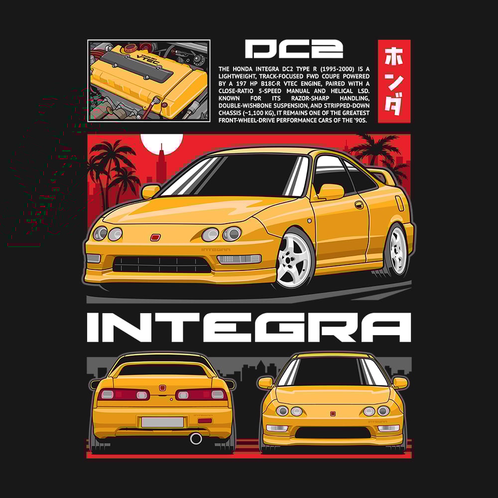 Celebrate the iconic '90s JDM legend with this premium digital artwork. The design captures the essence of the Honda Integra DC2 Type R, featuring its legendary 197 HP B18C-R VTEC engine and razor-sharp handling in a bold, high-impact style. Perfect for car enthusiasts, JDM fans, or anyone who appreciates classic performance icons.