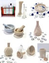 Pattern set includes instructions for: Beaker, Petri Dish, Test Tube, Funnel, Büchner funnel, Erlenmeyer flask, Florence Flask, Graduated Cylinder, and Mortar and Pestle.