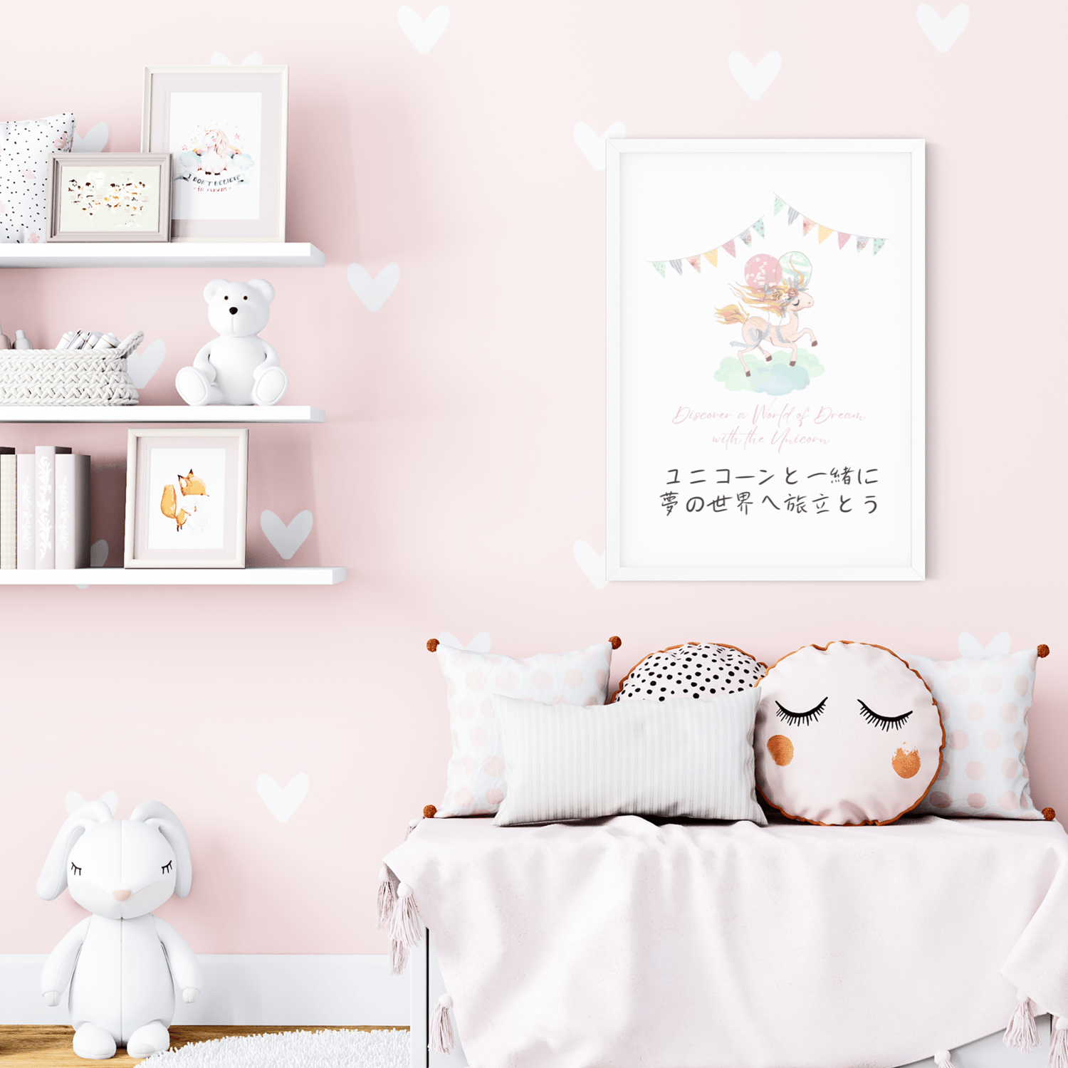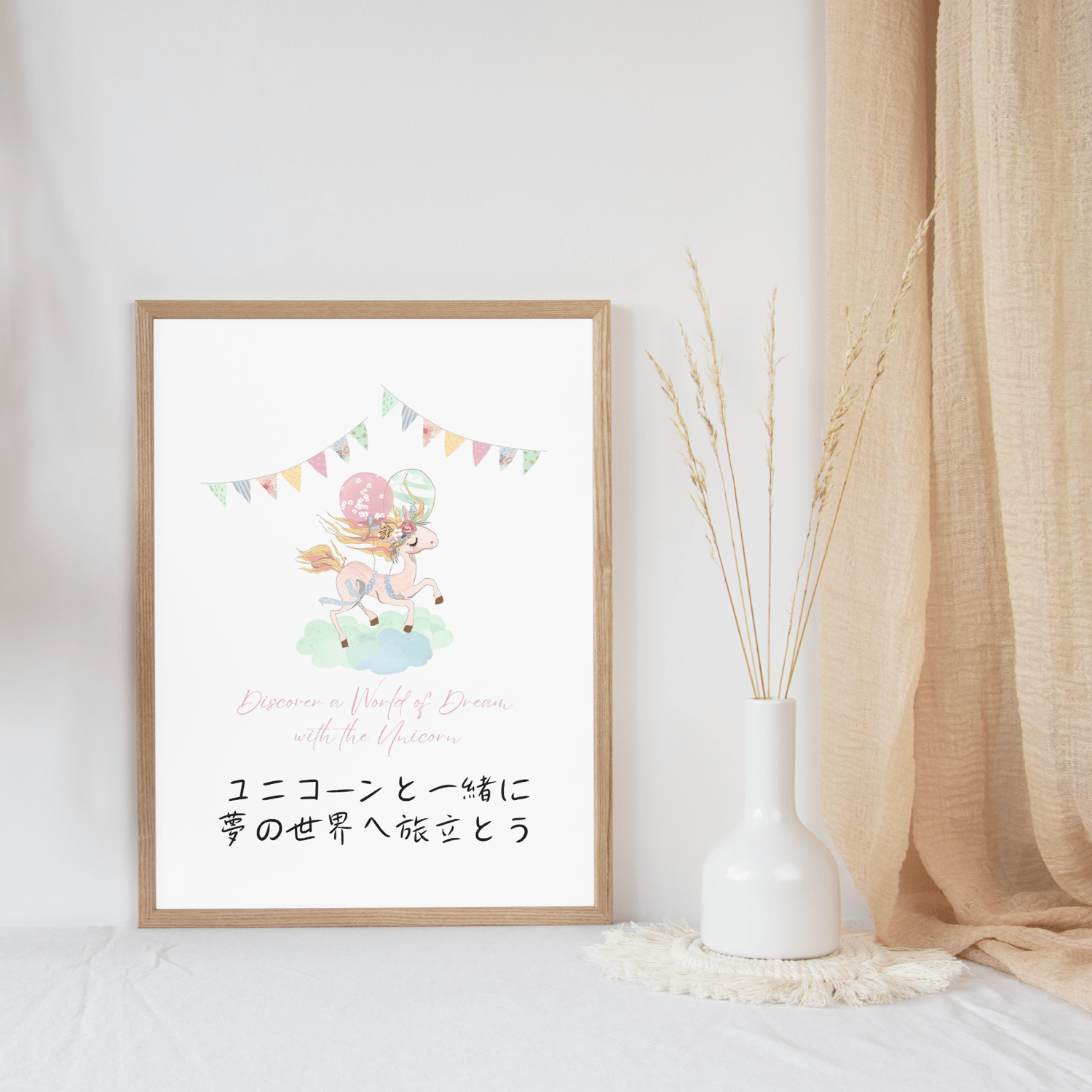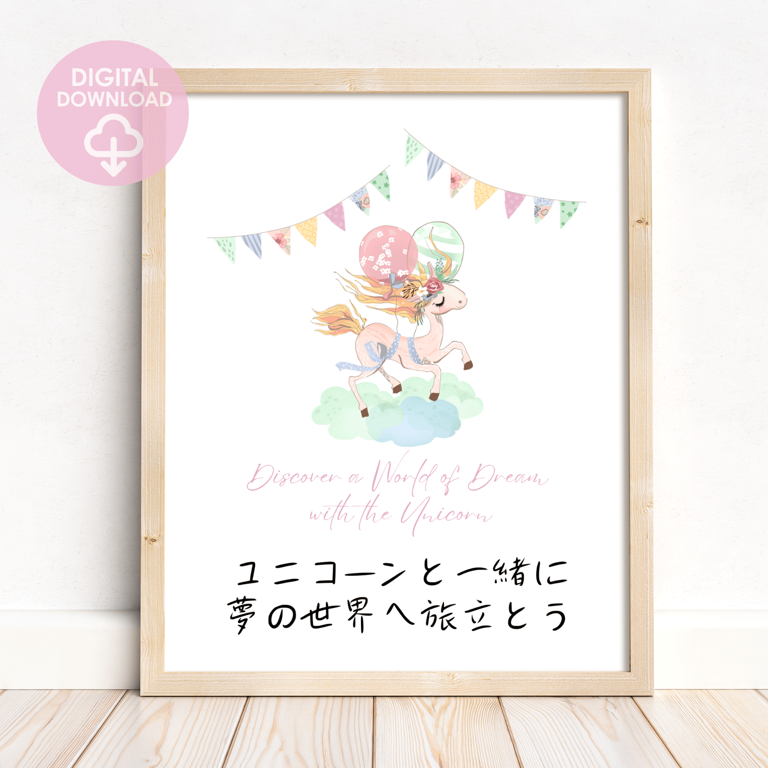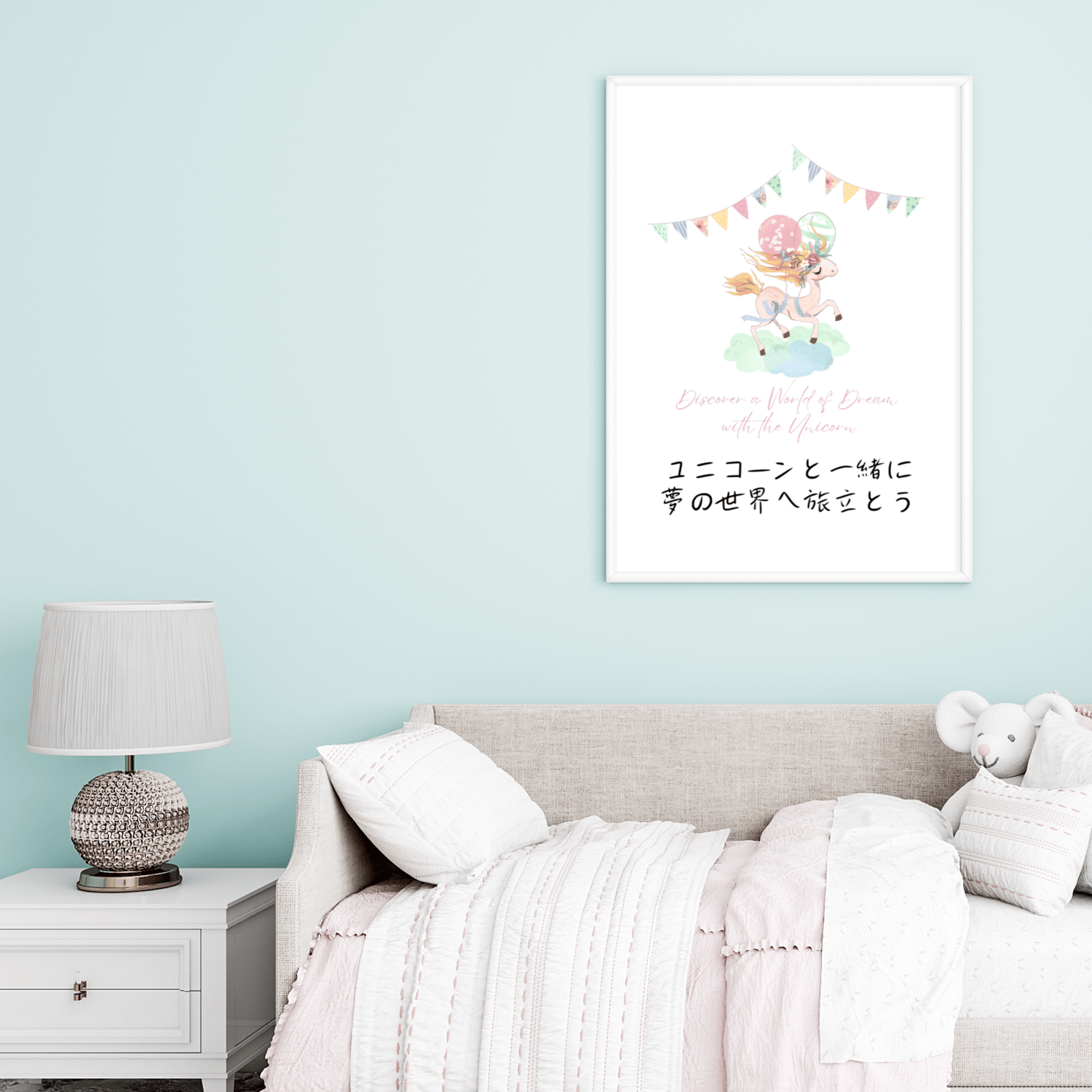 Brighten your little girl's room with this charming wall art featuring a beautiful watercolor unicorn in gentle pastel shades. The artwork includes an inviting quote in Japanese and English, encouraging dreams and imagination. This high-quality printable piece is perfect for girls' bedrooms and nurseries, adding a touch of magic and serenity.