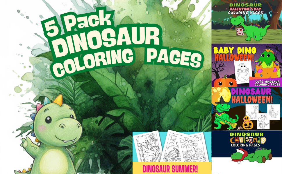A holiday adventure with this exciting 5-pack of dinosaur coloring pages! With 20+ pages in each themed collection, kids will enjoy over 100 fun and creative designs featuring various dinosaurs celebrating all year long.