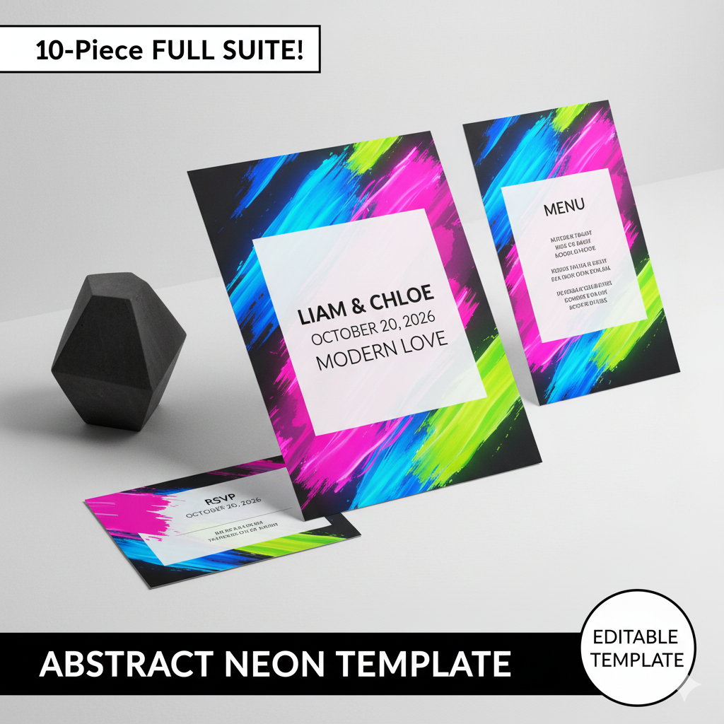 BOLD Abstract Modern 10-Piece Neon Wedding Suite | Gallery Art Theme | Editable Template