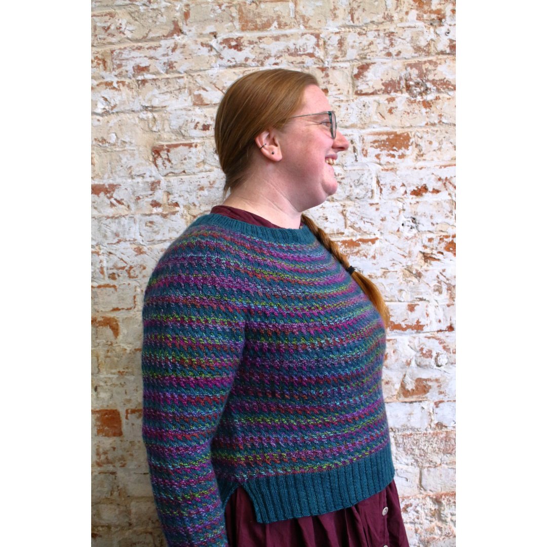 The construction starts with a circular yoke, from the top-down, and ends with a relaxed split hem. In this design, I have included optional bust shaping to improve the fit.