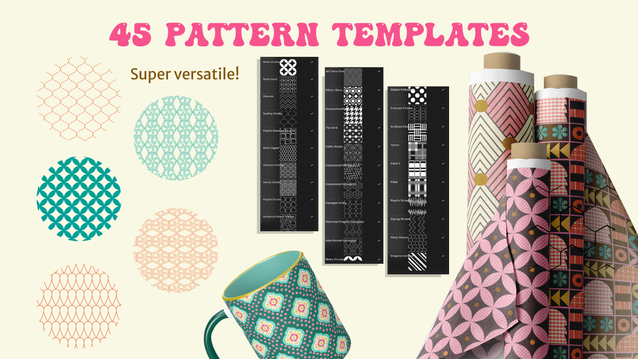Are you struggling to create geometric patterns in Procreate? Tired of snapping every shape to perfection? Want to design more interesting patterns without the hassle of figuring out proper repetition? Say hello to the ALL-IN-ONE GEOMETRIC PATTERN CREATOR—your digital resource with 190 elements at your fingertips! From ready-to-stamp geometric shapes to a variety of pattern templates exploring multiple repeats, plus seamless textures and pattern brushes to add extra flair to your work.