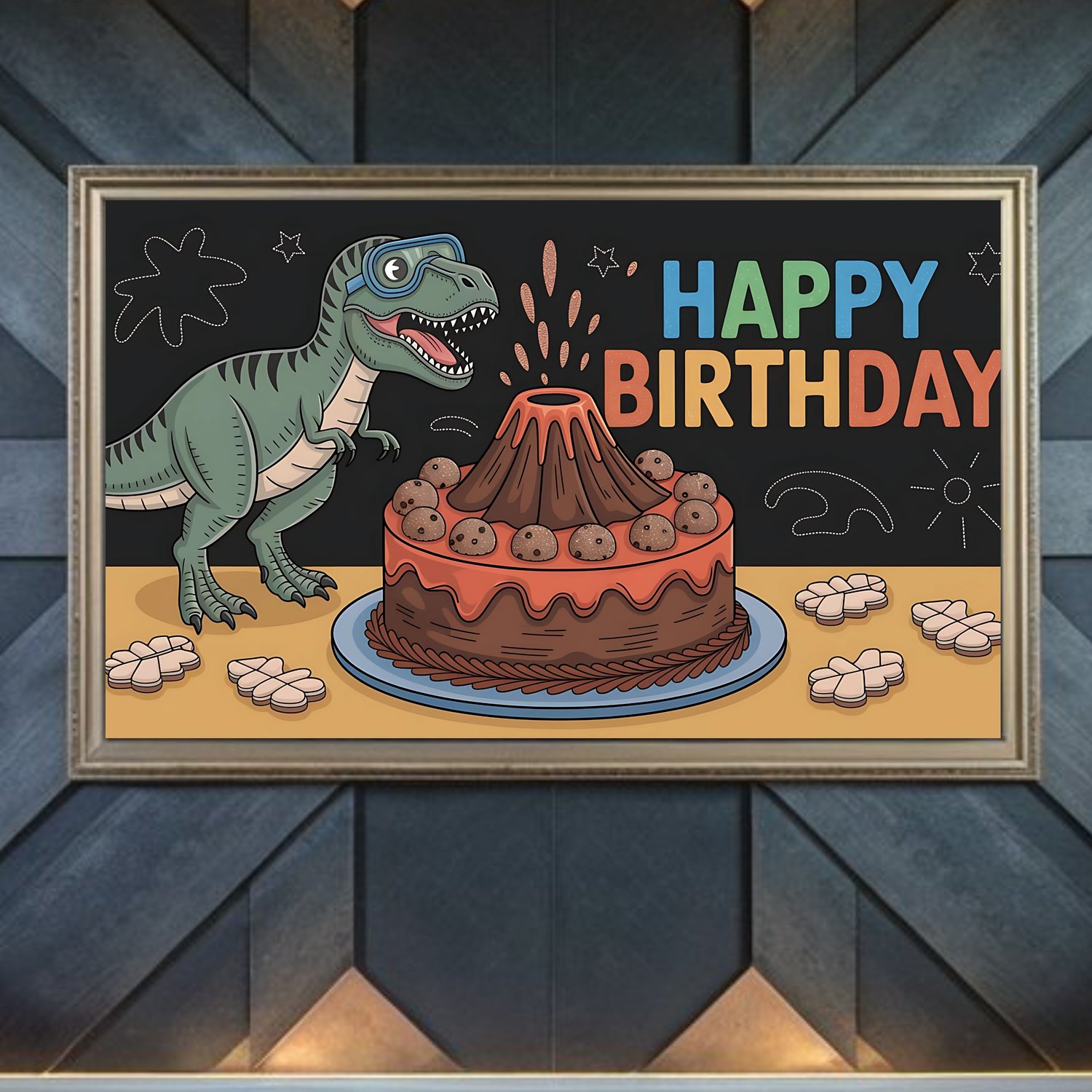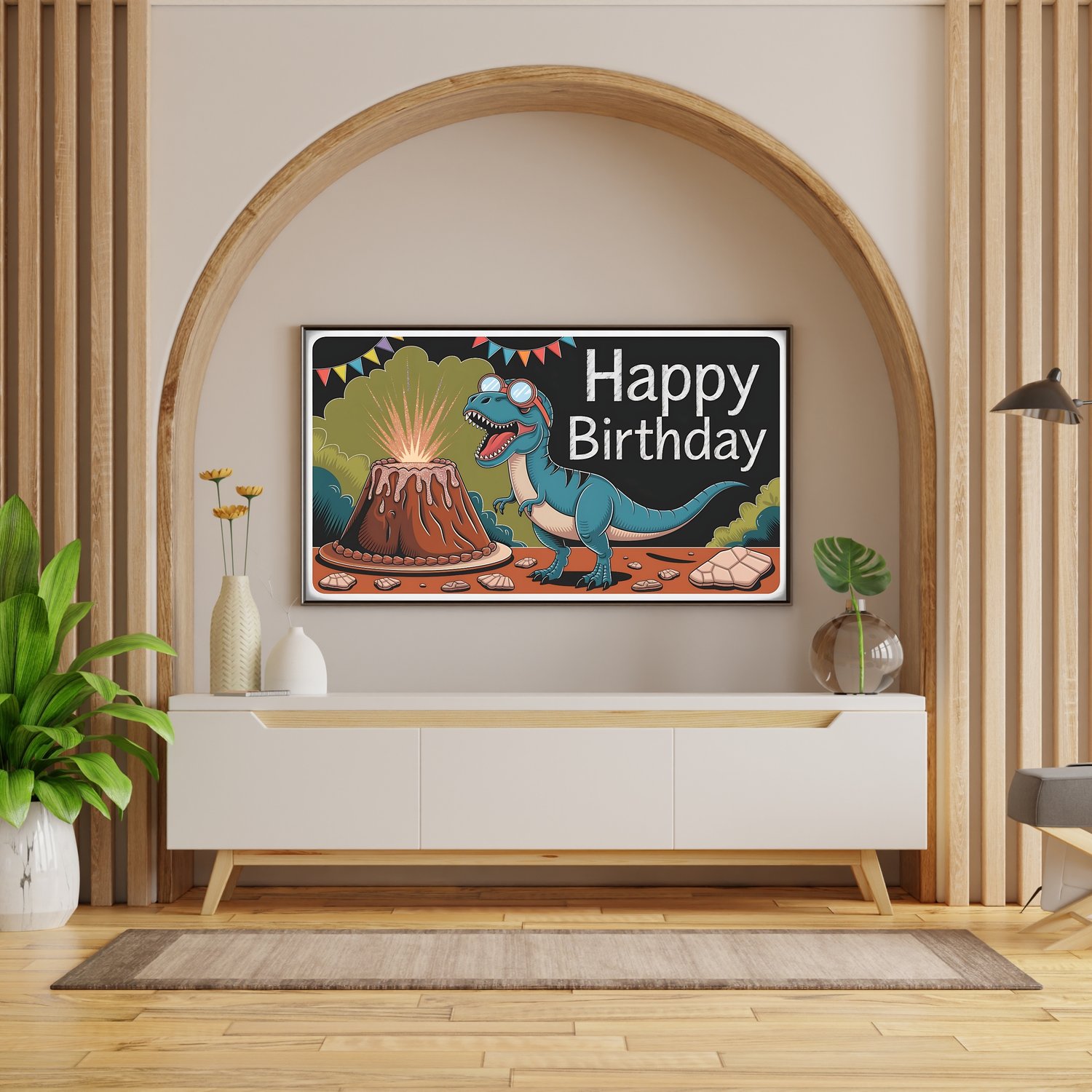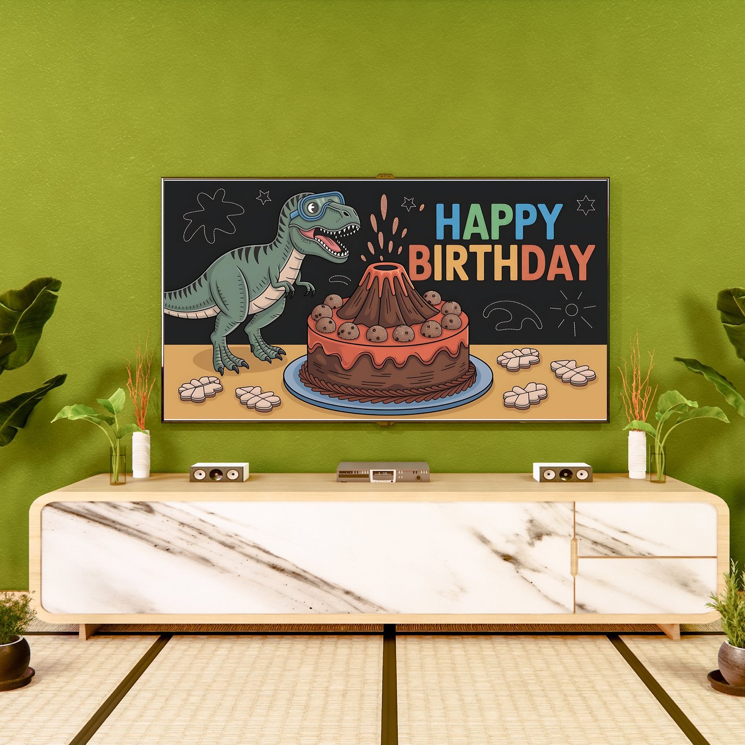 Dinosaur STEM Birthday Art - Volcano Cake & Lab Dino Frame TV Decor | Buy 1, Get 1 Free (2 Designs) | 4K Kids Party Digital Download