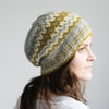 The hat is worked bottom-up in the round, with a striped brim for a sporty look and some colorwork on the body. There are instructions for a short and a long version.