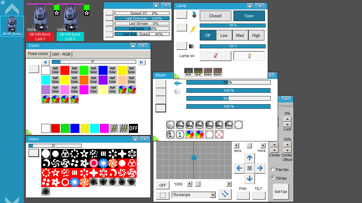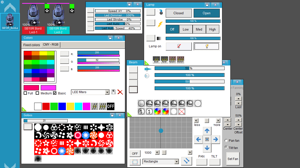 * Verifique, con el Fixture de pruebas de 30CH (click), que coincidan estos canales: 8 Dimmer, 7 Strobo/Shutter, 9 en el valor 55 = Celeste, 11 en el valor 50 = Gobo de Luna con estrella, 13 foco, 17 Dimmer del Aro Led, 21 Azul del Aro Led (ver cuarta foto).