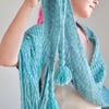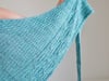 The textures of this design were inspired by the mesmerizing movement of water in river currents. The patterned panel running along one side of the piece is composed of traveling stitches, cables, and Japanese wrapped stitches, all flowing gently into each other and creating the effect of movement similar to the one seen on running rivers. The body of the shawl is worked in the broken twisted rib, resembling the play of light on the surface of constantly flowing water.