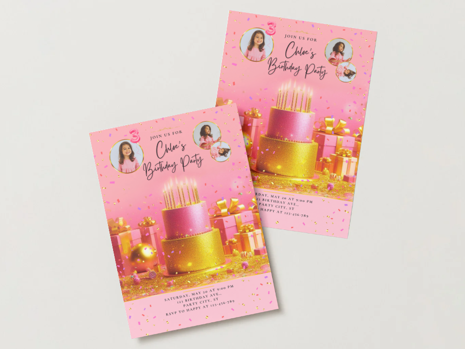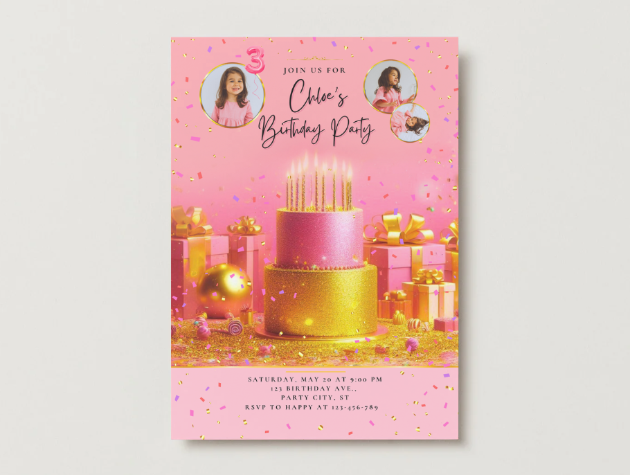 Celebrate in style with this elegant Pink & Gold birthday invitation! Perfect for girls of any age, this beautifully designed template lets you customize all the party details — right from your phone, tablet, or computer using Canva (free account works!).