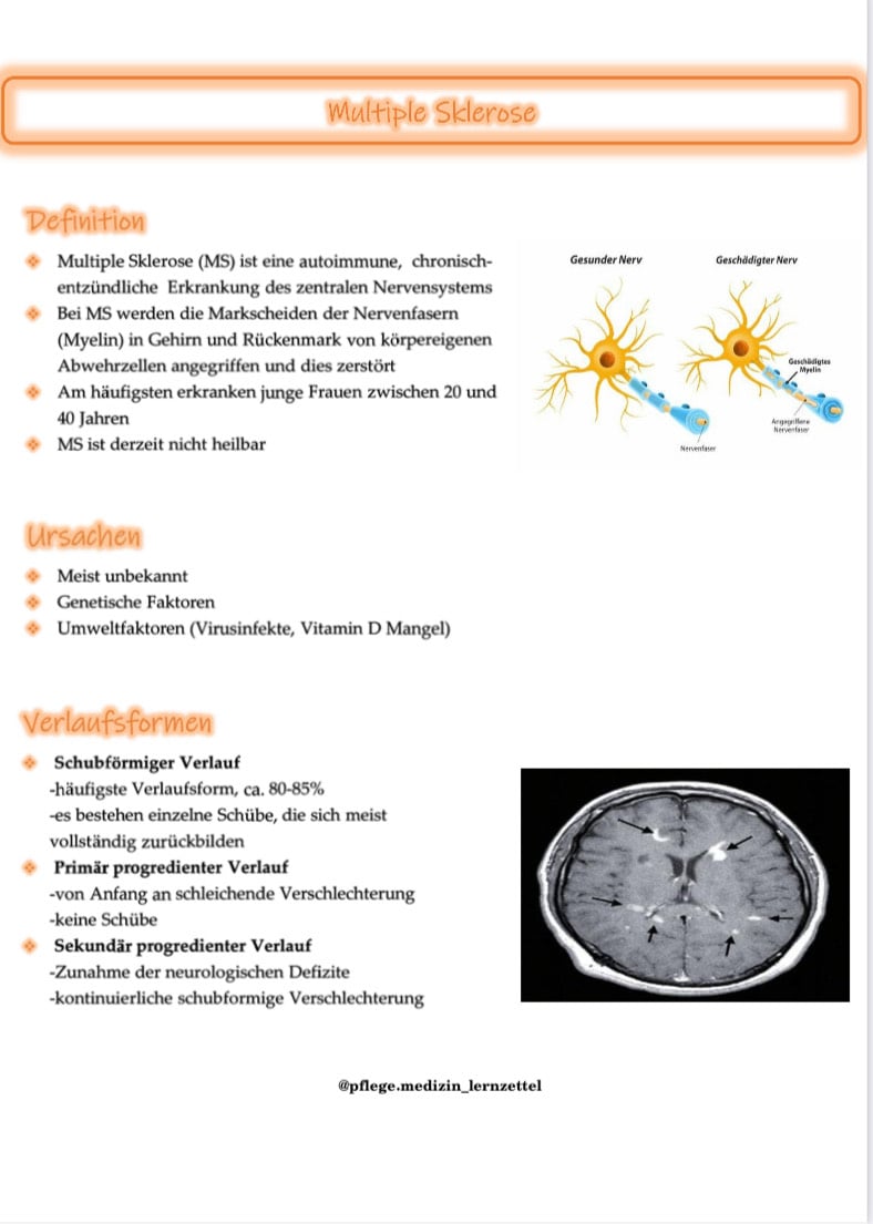 Dieser umfassende Lernzettel bietet eine klare und prägnante Übersicht über Multiple Sklerose. Der Lernzettel ist ideal für Schüler, Studenten und Fachkräfte im Gesundheitswesen, die sich fundiert über die Erkrankung informieren möchten