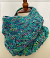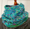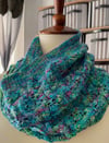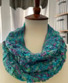 The Wannabe Cowl knitted in the round, calls for one 100 gram skein of fingering weight yarn. This cowl is a fun and easy knit, suitable for beginning lace knitters and interesting enough for advanced lace knitters.