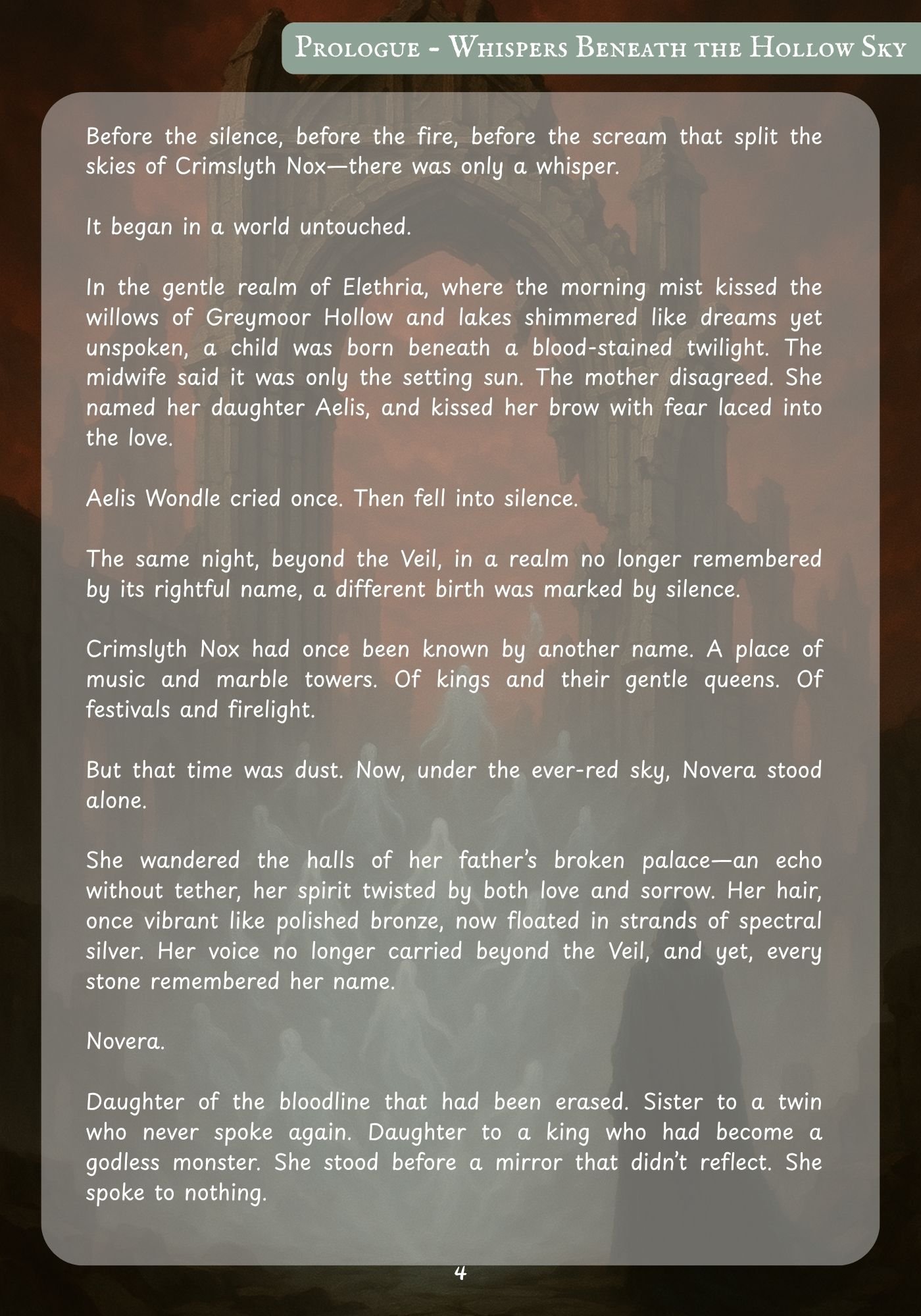 With her magic refined and her soul hardened, Aelis crosses once more into the blood-stained sky of Crimslyth Nox. There, she meets a guide: Novera, the spirit of a forgotten princess whose death centuries ago shattered an entire world. Together, they navigate a landscape of suffering, memory, and the undead remnants of sorrow. Their mission is twofold—rescue Varos, and close the Veil Gateway permanently before the Echoes can tear through the realms again.