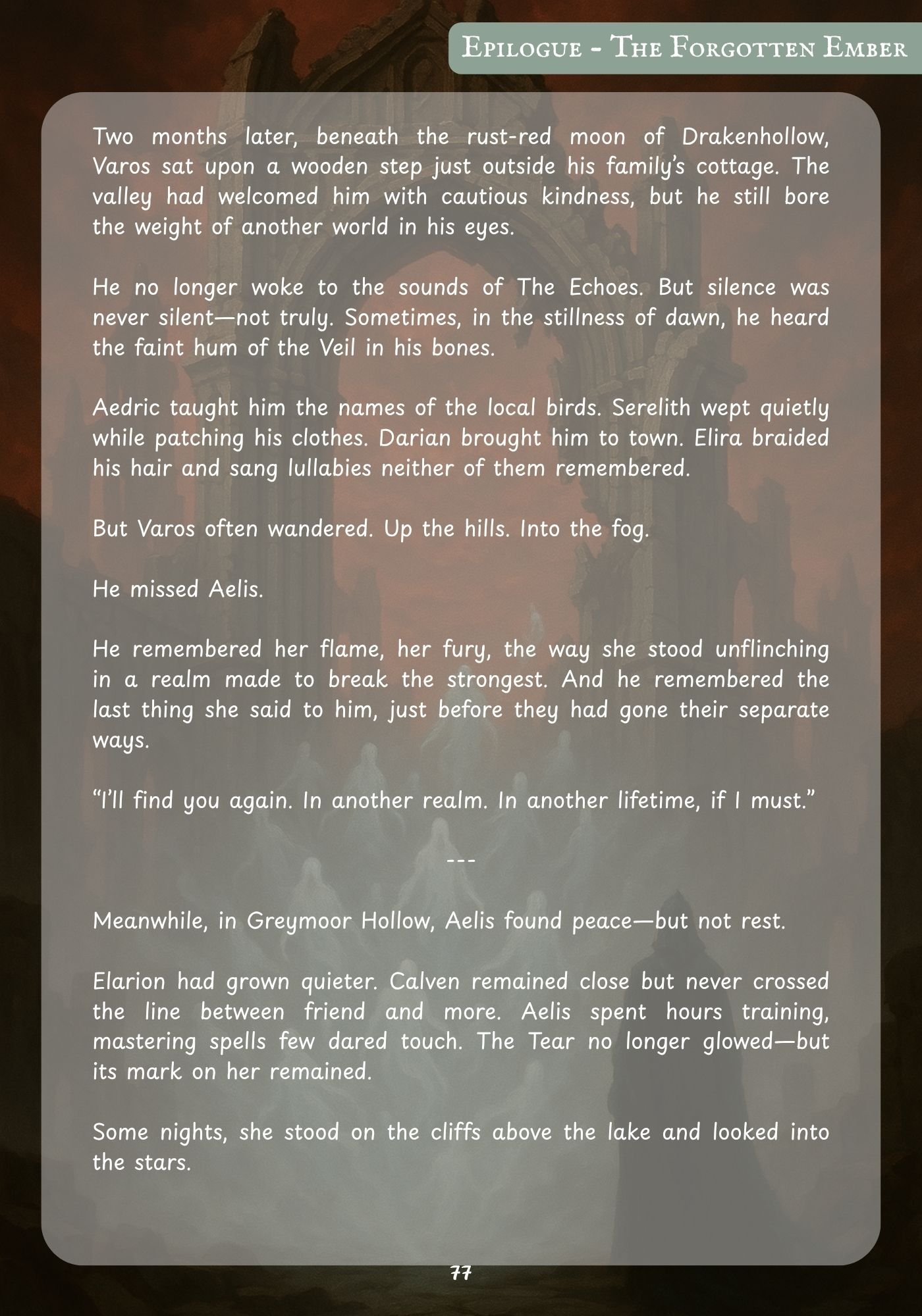 But endings do not come without cost. As love goes unspoken, and destinies drift apart, Aelis and Varos face the final parting of their intertwined fates. When the Veil sleeps, only silence remains... and with it, the question: Was this goodbye, or only a pause between lifetimes?