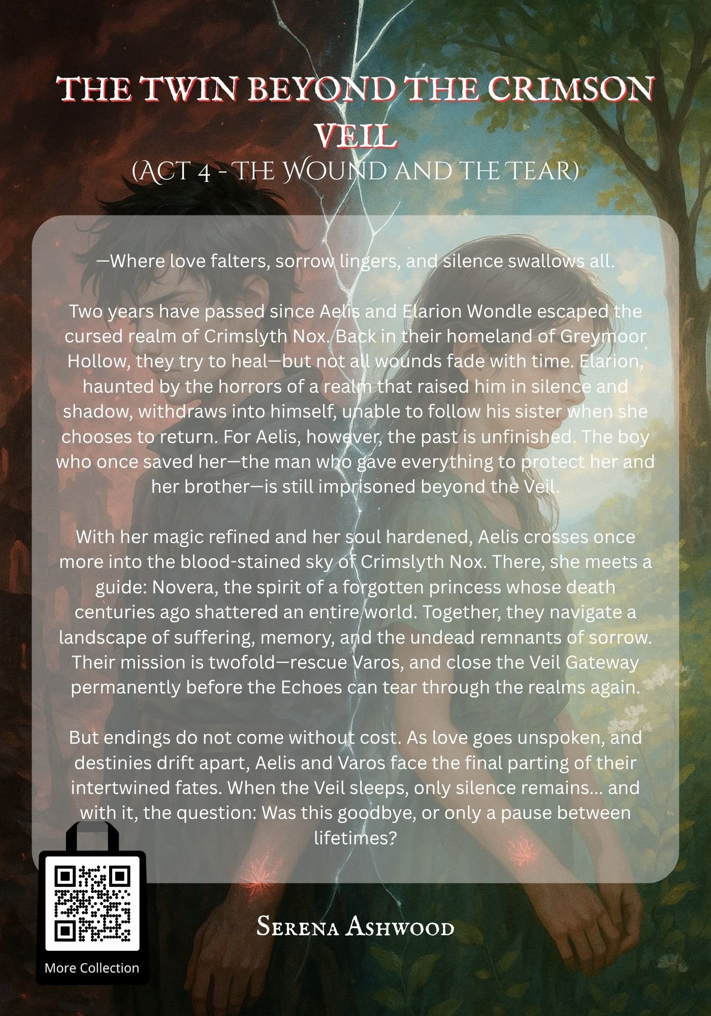 Two years have passed since Aelis and Elarion Wondle escaped the cursed realm of Crimslyth Nox. Back in their homeland of Greymoor Hollow, they try to heal—but not all wounds fade with time. Elarion, haunted by the horrors of a realm that raised him in silence and shadow, withdraws into himself, unable to follow his sister when she chooses to return. For Aelis, however, the past is unfinished. The boy who once saved her—the man who gave everything to protect her and her brother—is still imprisoned beyond the Veil.