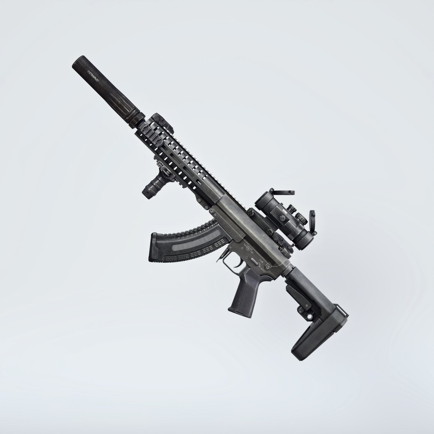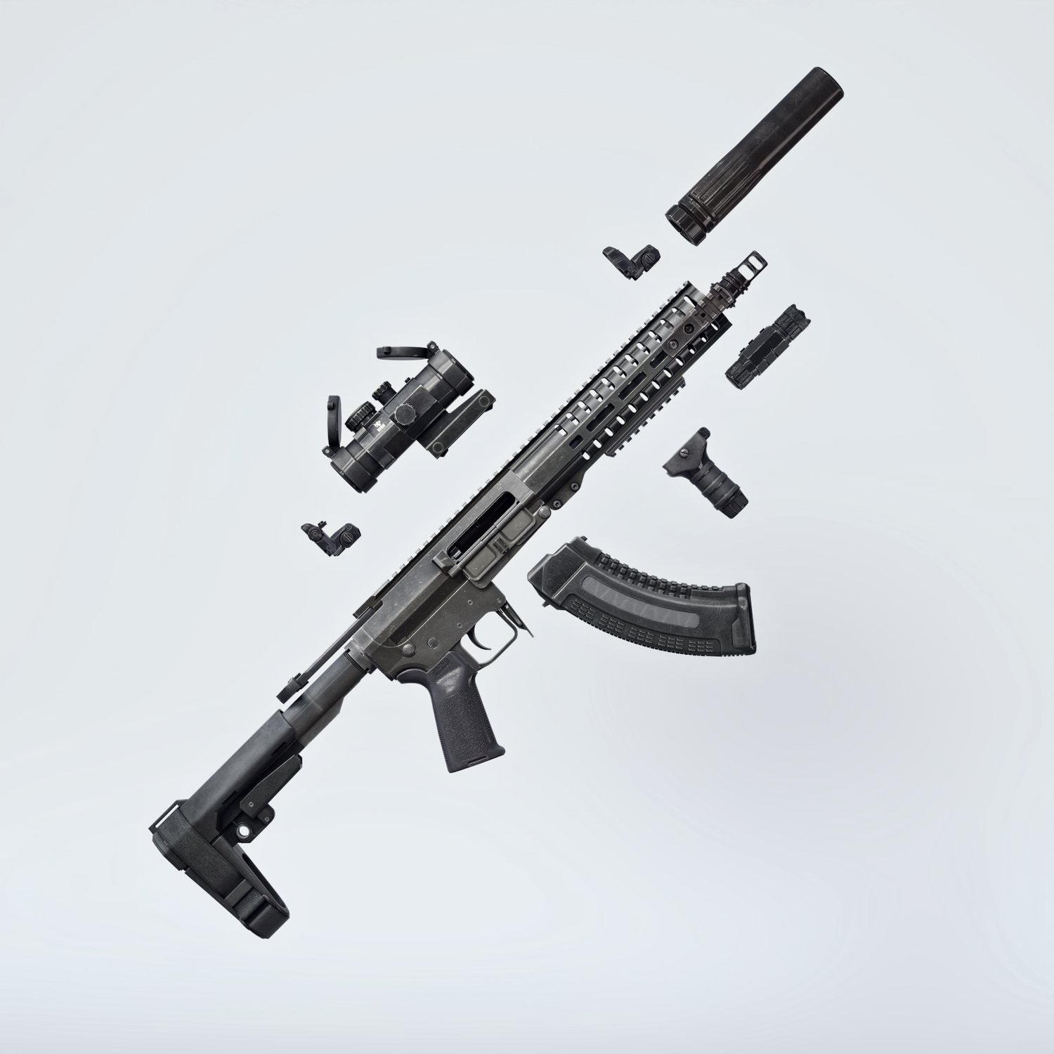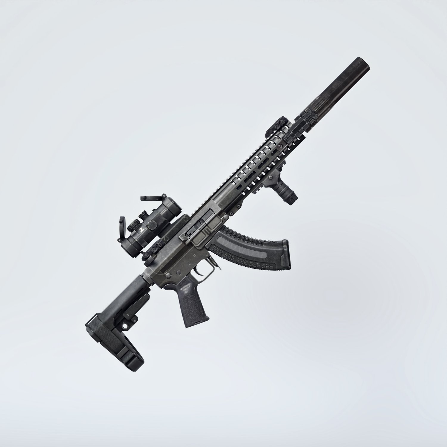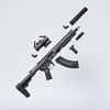 A cool looking mixed rifle (hence mutant). Kinda mix of the two most popular guns- AR 15 and AK platforms. Includes a silencer, red dot sight, a laser and a front grip. Iron sights are also rigged in case you want to upgrade. Trigger, stock, safety, bolt, bolt cover etc also rigged for more realistic pictures. The prop is converted and rigged for use in DAZ.