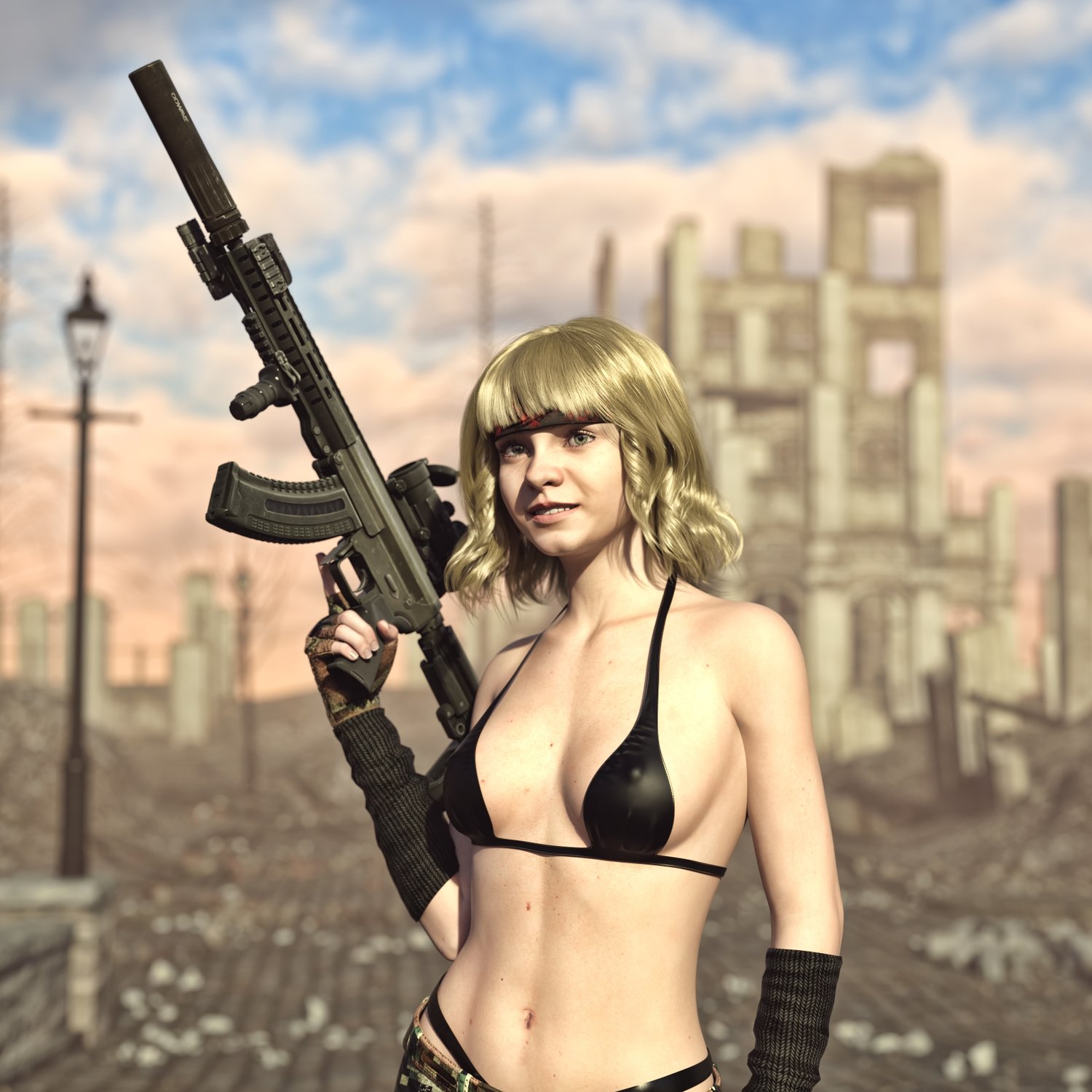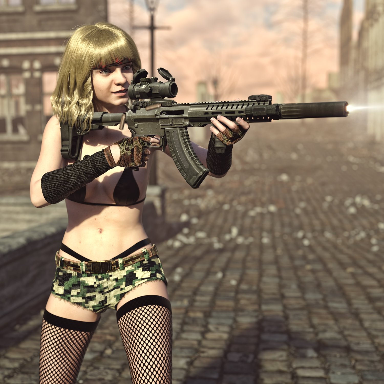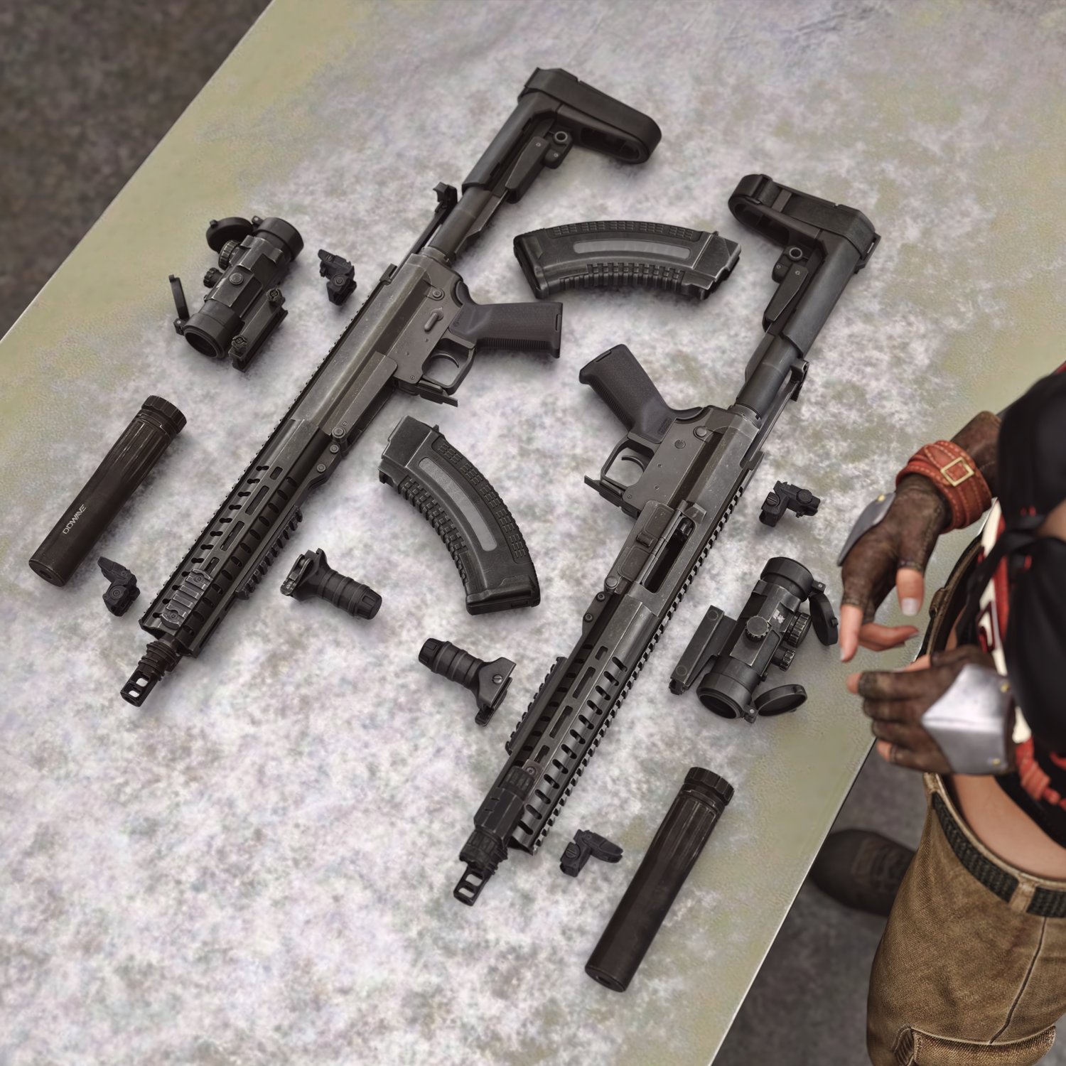 A cool looking mixed rifle (hence mutant). Kinda mix of the two most popular guns- AR 15 and AK platforms. Includes a silencer, red dot sight, a laser and a front grip. Iron sights are also rigged in case you want to upgrade. Trigger, stock, safety, bolt, bolt cover etc also rigged for more realistic pictures. The prop is converted and rigged for use in DAZ.