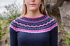 Playful zig-zag patterning decorates the yoke of this pullover, combining traditional colorwork techniques with a modern shape. Three-quarter length sleeves and a slightly cropped fit update a traditional fair isle pullover, which is finished off with contrast trim at cuffs and hem. Worked from the top down, short rows are used to raise the back neck.