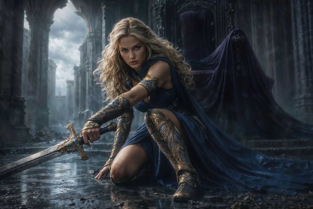 This ultra-high-resolution artwork captures a fierce warrior poised in shattered halls—rain-slick stone, crumbling arches, and a throne wrapped in shadow behind her. The scene is pure cinematic fantasy: ornate armor detailing, a beautifully crafted blade, and a stormy atmosphere that makes every highlight and reflection feel alive.