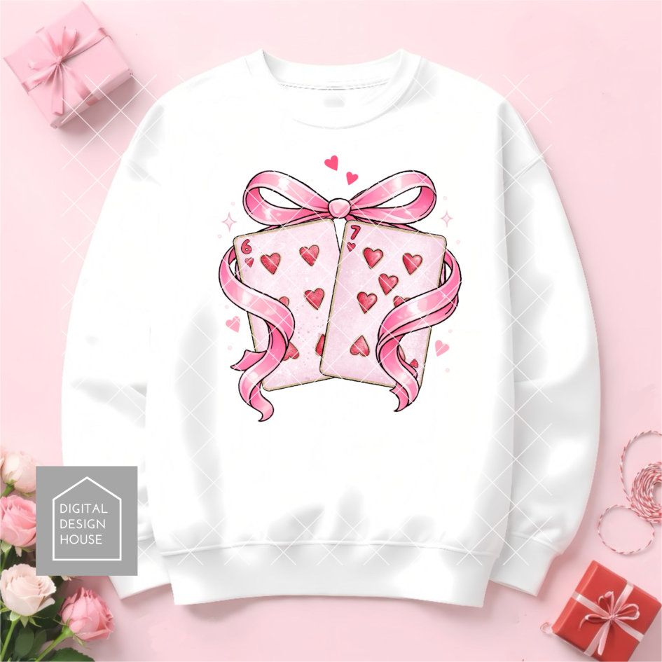This bang on trend 6 & 7 Valentine pun design features heart playing cards with a pink bow, making it perfect for t-shirts, gifts, cards, and more.