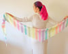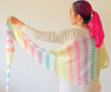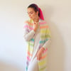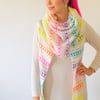 This shawl was dreamed up as an ode to bright and adventurous yarn colors. It features a beautiful set of neon rainbow minis from Seismic Yarn highlighted and slightly mellowed down with white Suri alpaca. The pattern could work well with one skein of variegated or ombre yarn used for a contrast color as well. Or maybe dive into your stash and get a whole lot of yarn leftovers and scraps to use for each stripe!