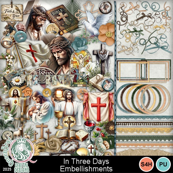 This one covers the true meaning of Easter from crucifixion to resurrection with beautiful clip art. It also has lots of frames, flowers, bows, ribbons, and stitches to make your projects special.