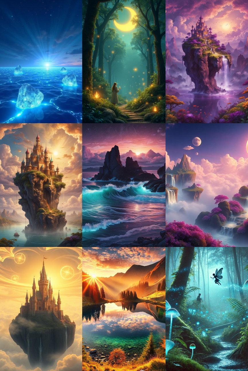 - Themes include floating castles, glowing forests, surreal oceans, and mystical creatures.