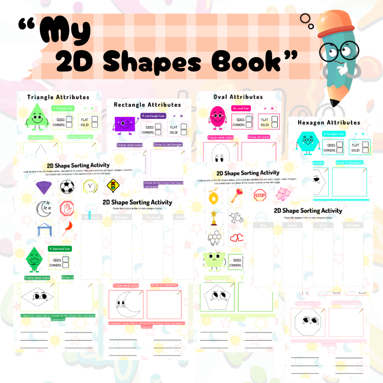Whether you're a parent, teacher, or homeschooler, this 2D shapes printable workbook is a must-have in your early education toolkit. It covers all the key 2D geometric shapes—circle, square, triangle, rectangle, heart, star, and more!