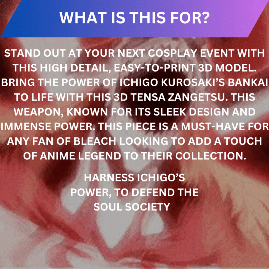 - Cosplay-Ready: 🎭 Crafted with cosplay in mind, this model is designed to be lightweight yet durable, allowing you to wield it comfortably at conventions, photoshoots, or any event. Impress fellow fans with an authentic, eye-catching prop that captures the essence of Ichigo’s Bankai.