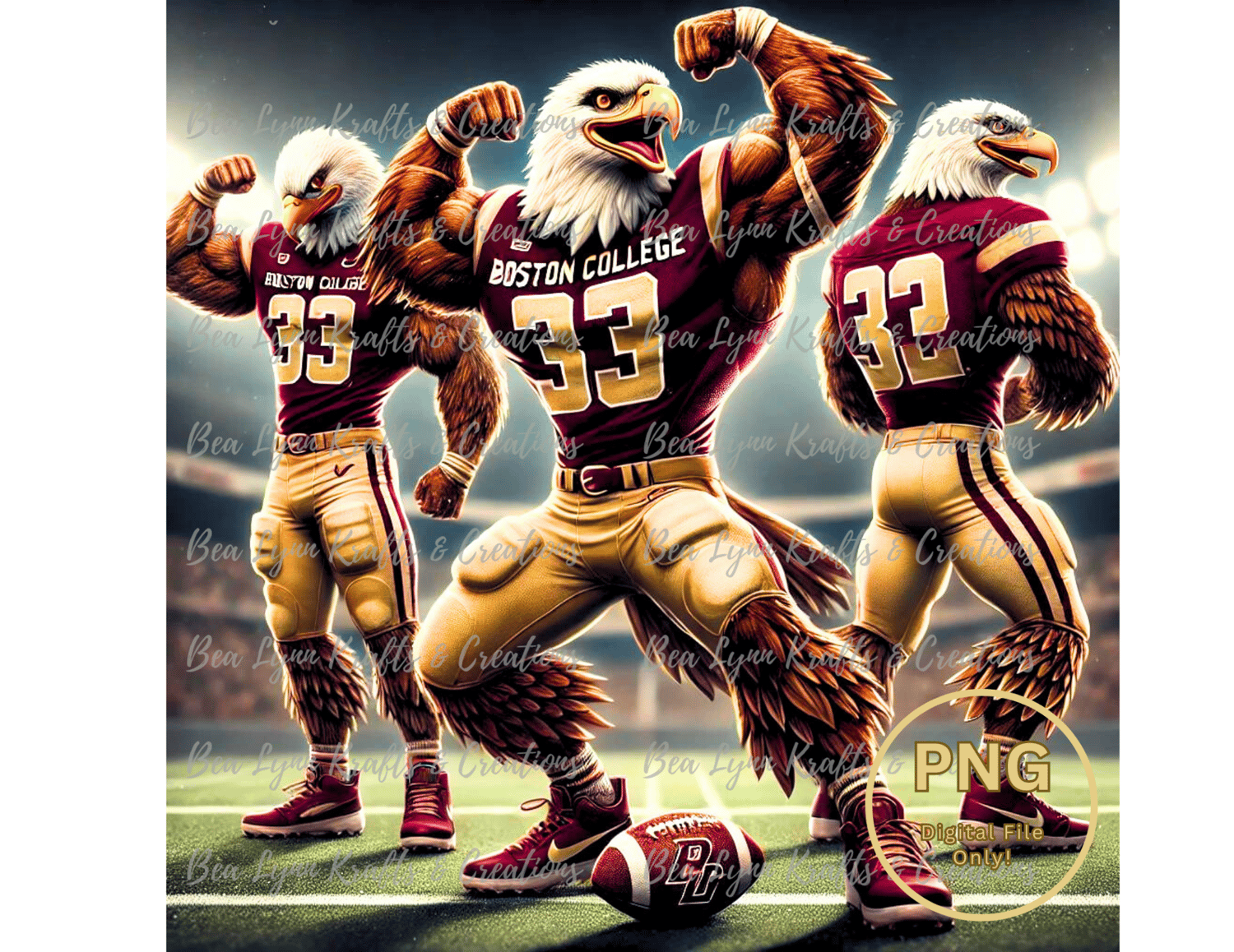 Get ready to soar, Boston Eagles fans! This high-energy digital illustration captures the fierce, unstoppable spirit of our beloved Boston College Eagles mascot in three dynamic poses. Whether he's flexing his powerful wings, celebrating a touchdown victory, or crouched low, ready to strike, this artwork embodies the relentless determination and pride that defines our team!