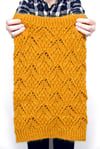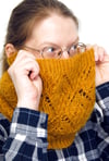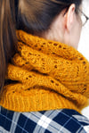 In photography, the moment right before sunset and shortly after sunrise is called the ‘golden hour’. During this time, daylight is softer and warmer in hue than when the sun is higher in the sky.Golden Hour Cowl features an intricate and undulating lace pattern reminiscent of hourglasses. Create your own magical moment with this shimmering cowl knit with one strand of fingering-weight sock yarn and the other a fluffy silk-mohair. Choose two yarns with similar colors to let the lace pattern shine.