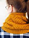Golden Hour Cowl is knit in the round using short or long circular needles, starting and ending with a bit of twisted ribbing. The length and circumference of the cowl can be easily adjusted to your liking.