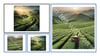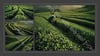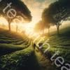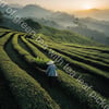 A vast field of green tea with tea leaf picker at dawn