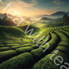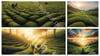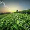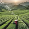 A vast field of green tea with tea leaf picker at dawn, captured with a wide-angle lens to capture the expanse.