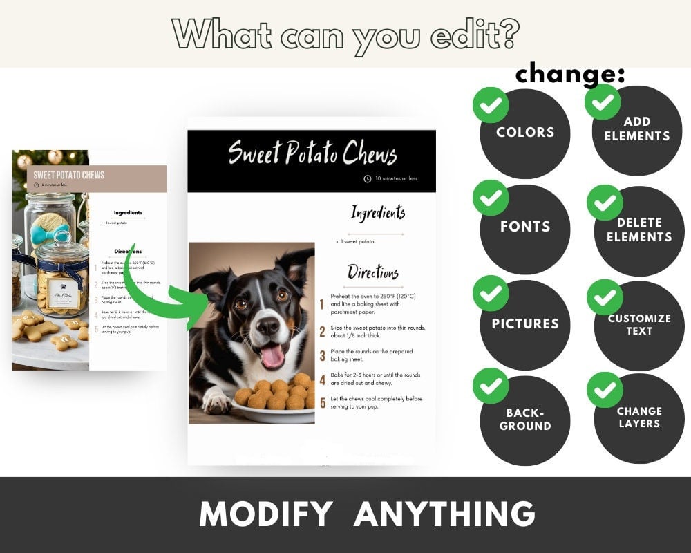 - A PDF with a link to a Canva template. Link to a recipe book with 10 homemade dog treats - Quick and easy in 10 minutes (20 pages)