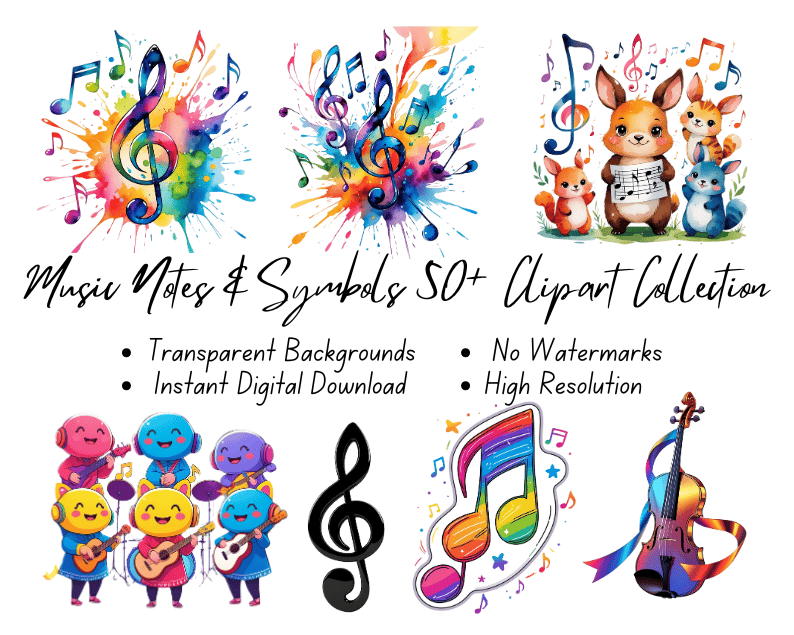 Elevate your creative projects with this 50+ Music Notes & Symbols Clipart Collection! Perfect for musicians, educators, content creators, and hobbyists, this high-resolution digital set features a variety of musical notes, symbols, clefs, rests, and other music-related elements in crisp, clear designs.