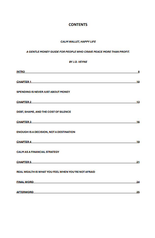 Inside, J.D. Veyne guides you through a quiet reset—helping you untangle the emotions behind spending, dissolve quiet shame around debt, and decide what enough truly means.