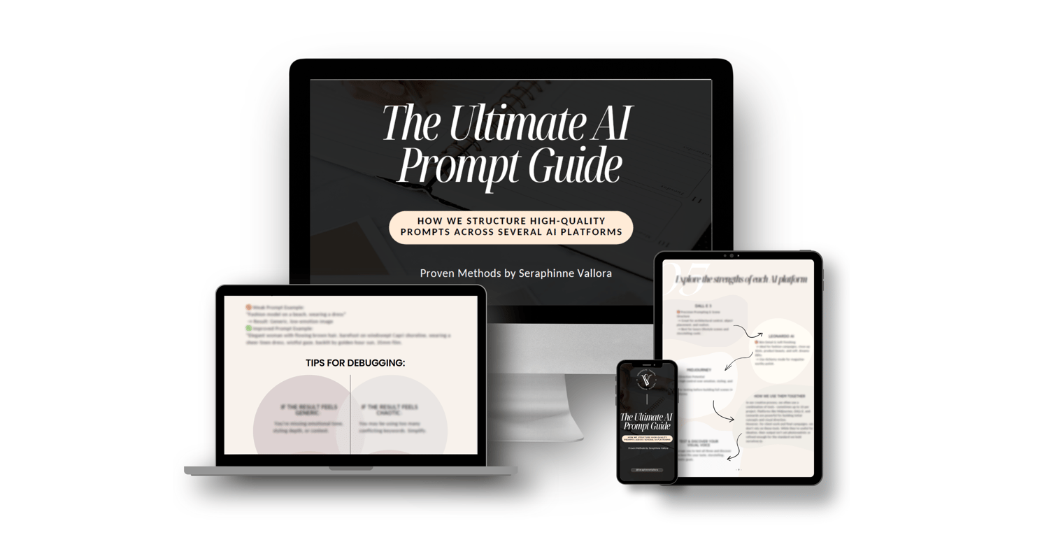 This isn’t just another list of AI prompts. This is a creative direction toolkit designed to help fashion-forward founders, designers, content creators, and storytellers build stunning, emotionally resonant imagery with tools like Midjourney, DALL·E, and Leonardo AI — no tech background required.
