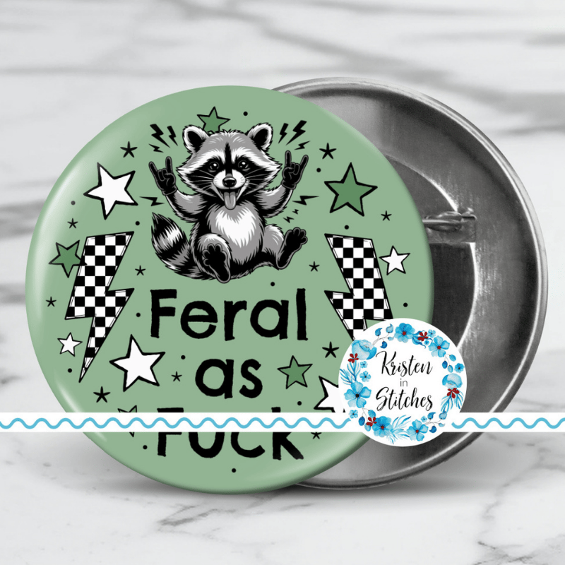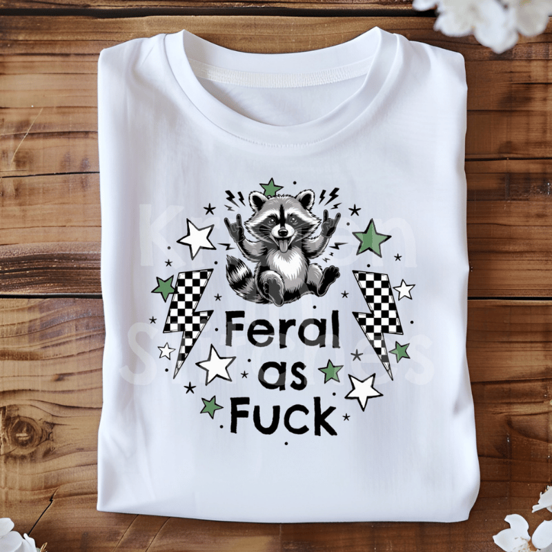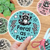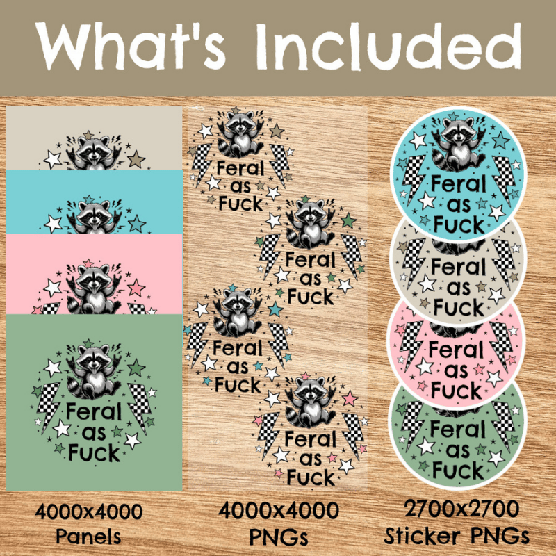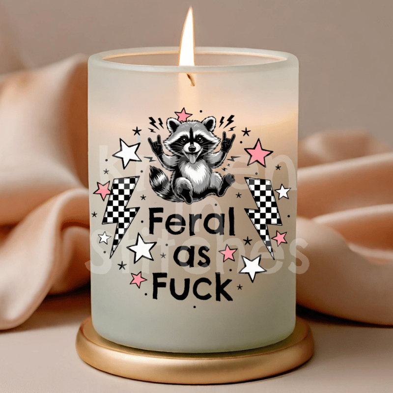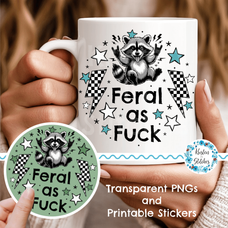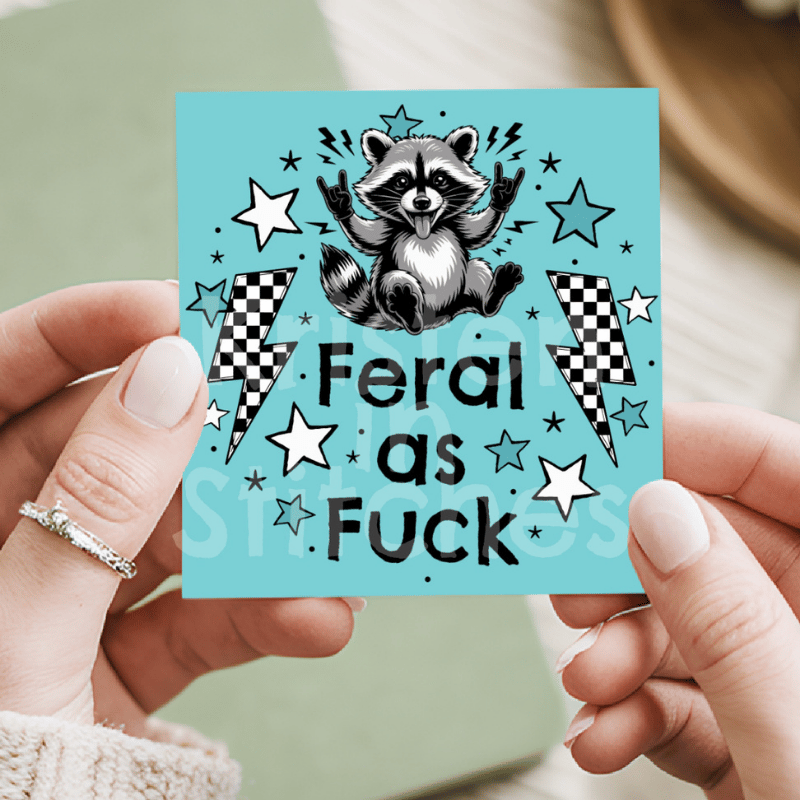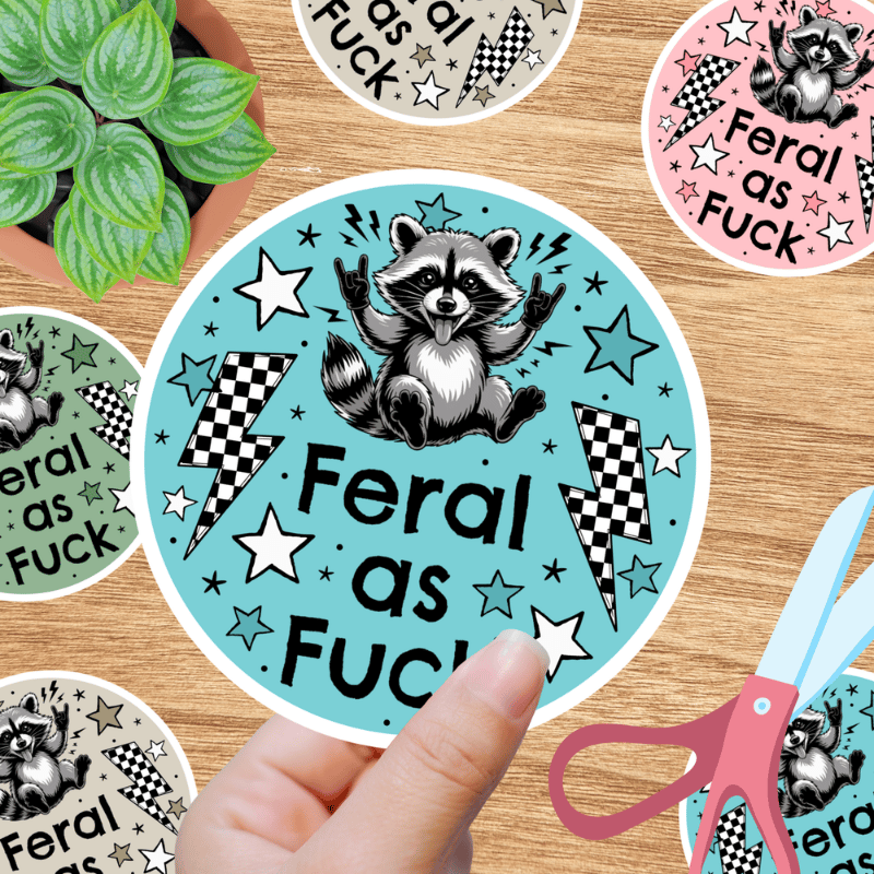Feral as Fuck sarcastic, sweary raccoons. Graphics for stickers, badge reels, jar and candle labels, uv dtf transfers, shirts, digital journals and so much more!