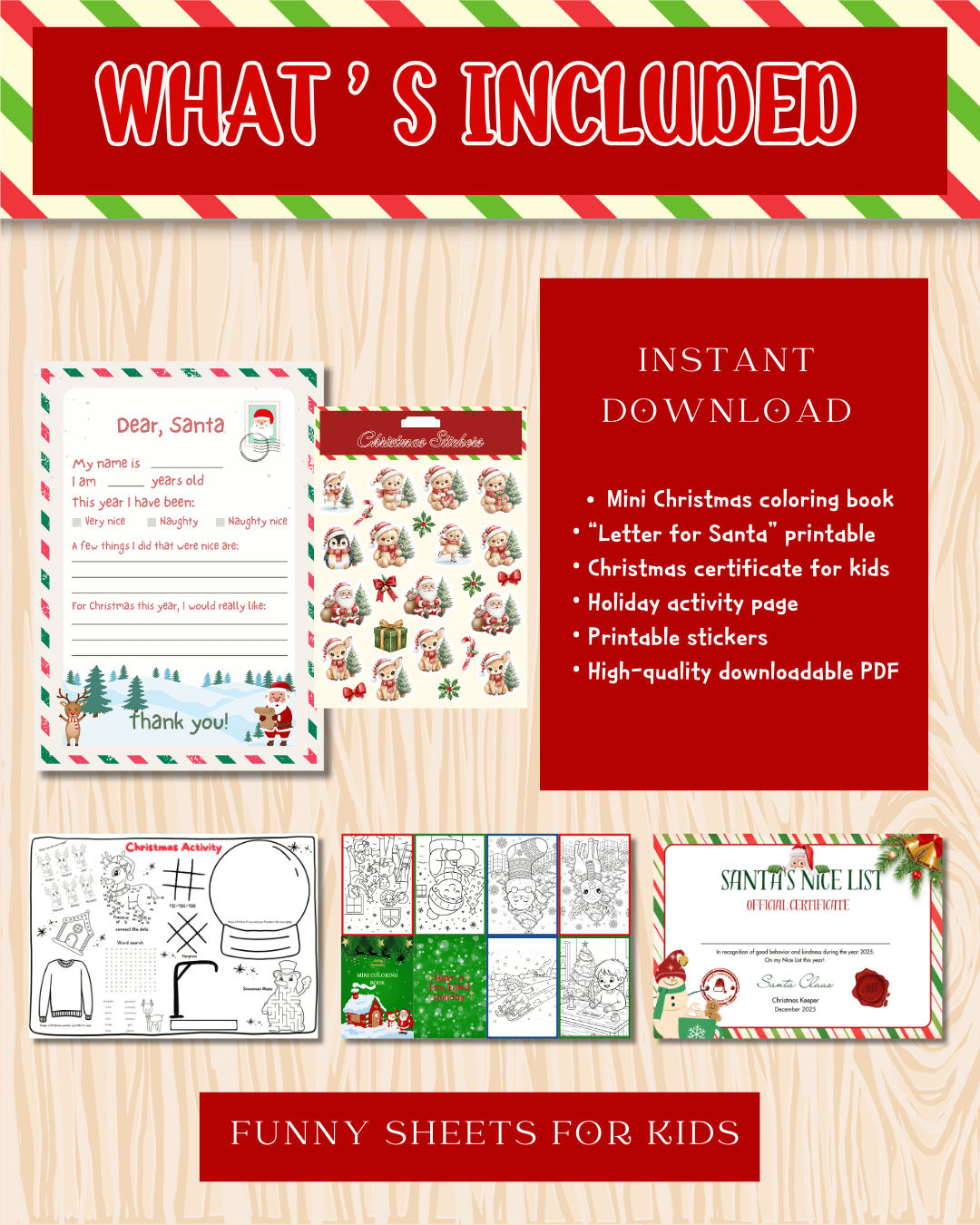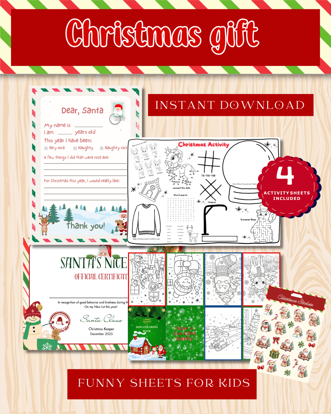 This Christmas Kids Activity Gift Pack is the perfect printable holiday surprise for children! The bundle includes a mini coloring book, a Letter for Santa template, a Christmas certificate, a fun activity page, and cute festive stickers. Designed to spark creativity and holiday joy, this printable set is ideal for gifting, classroom fun, party favors, stocking fillers, and family activities during the Christmas season.