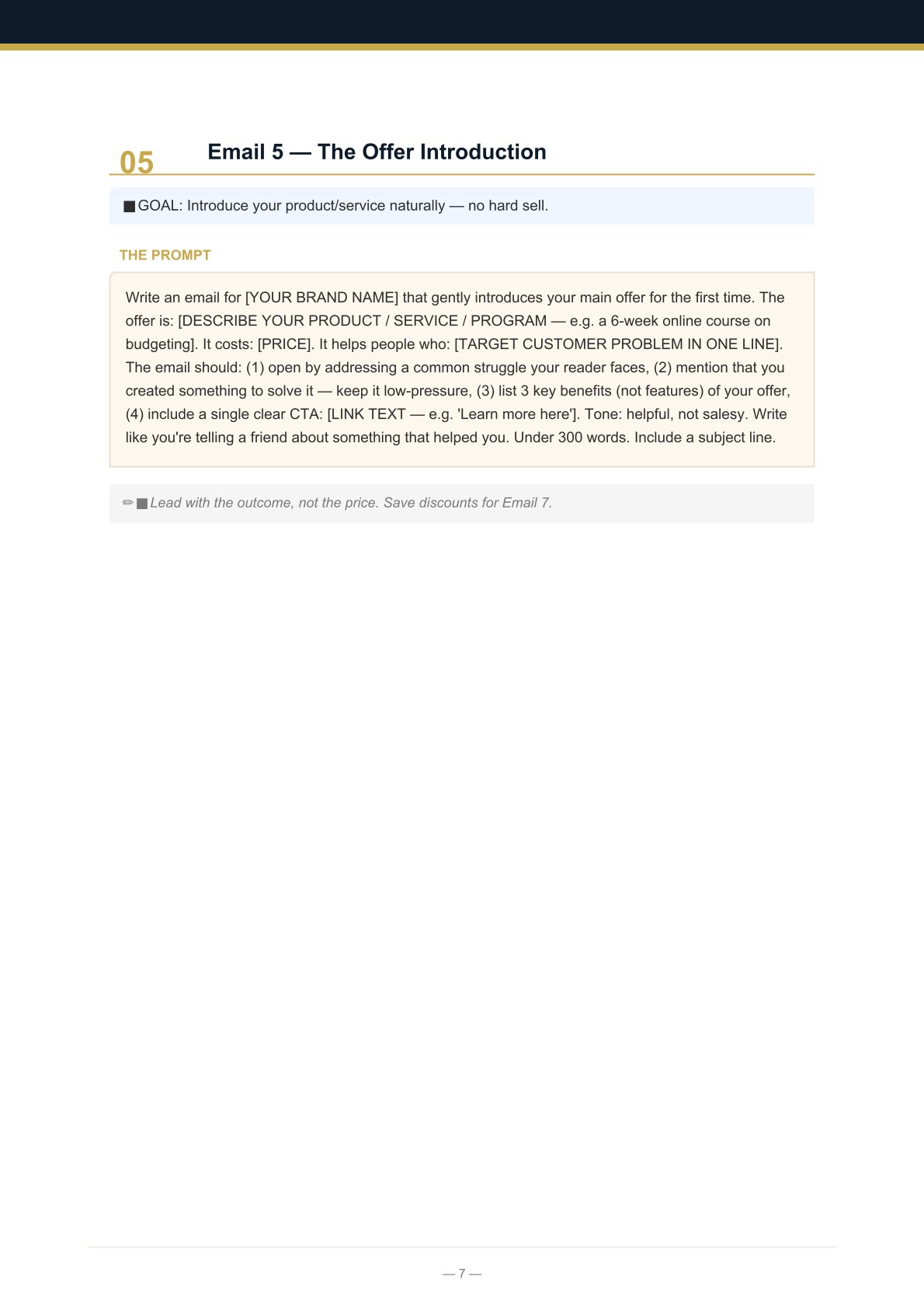 ✅ 7 core email prompts (Welcome → Story → Value → Proof → Offer → FAQ → Pitch)