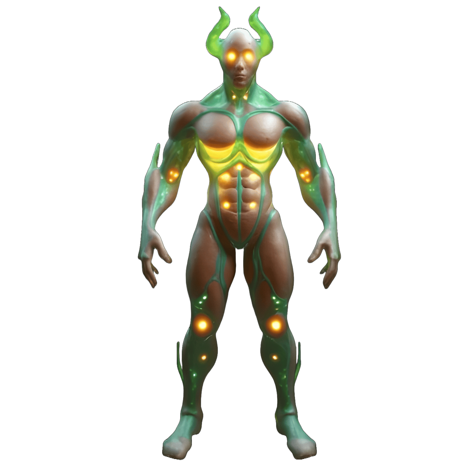 - Bioluminescent Warrior: A muscular humanoid with glowing veins and an alien-like presence.